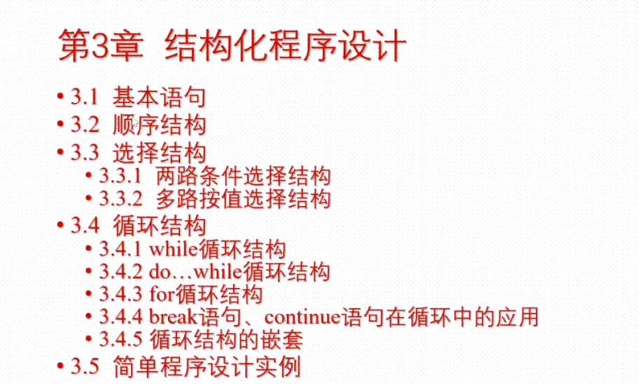 主要讲授了结构化程序设计的基本内容,重点围绕三种基本控制结构展开:基本语句与顺序结构,介绍程序中最基础的语句执行方式,即按顺序逐条执行;选择结构,包括两路条件判断和多路分支选择,用于根据不同条件执行不同代码块;循环结构,涵盖while、do…while和for三种循环方式,并讲解循环控制语句以及循环嵌套的使用;综合应用,通过简单程序设计实例,综合运用以上结构完成典型任务。