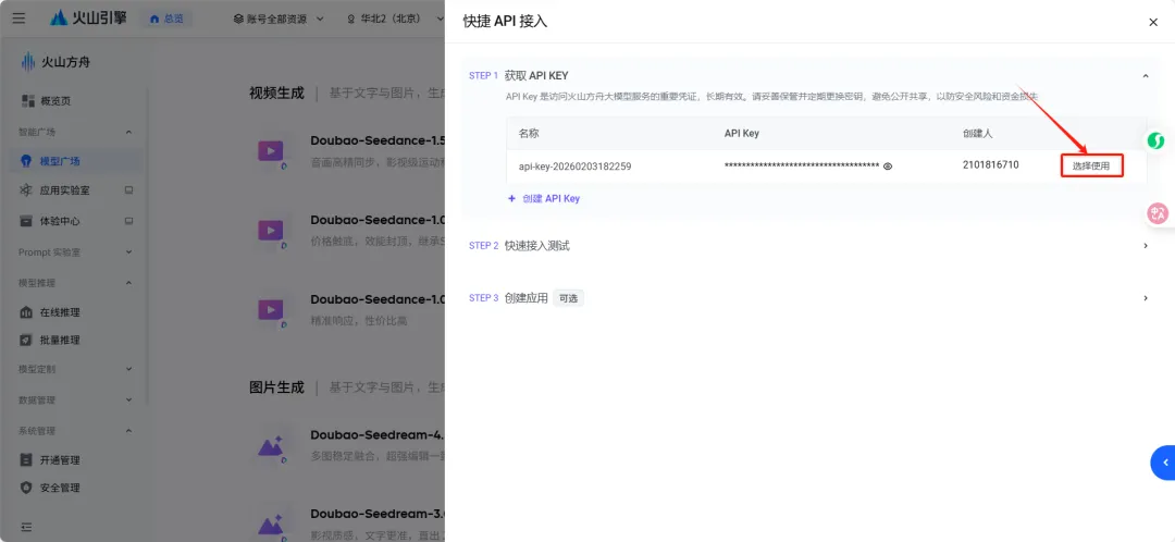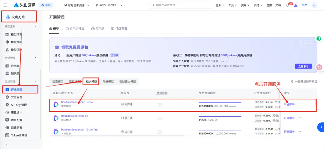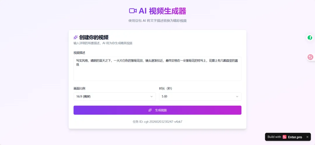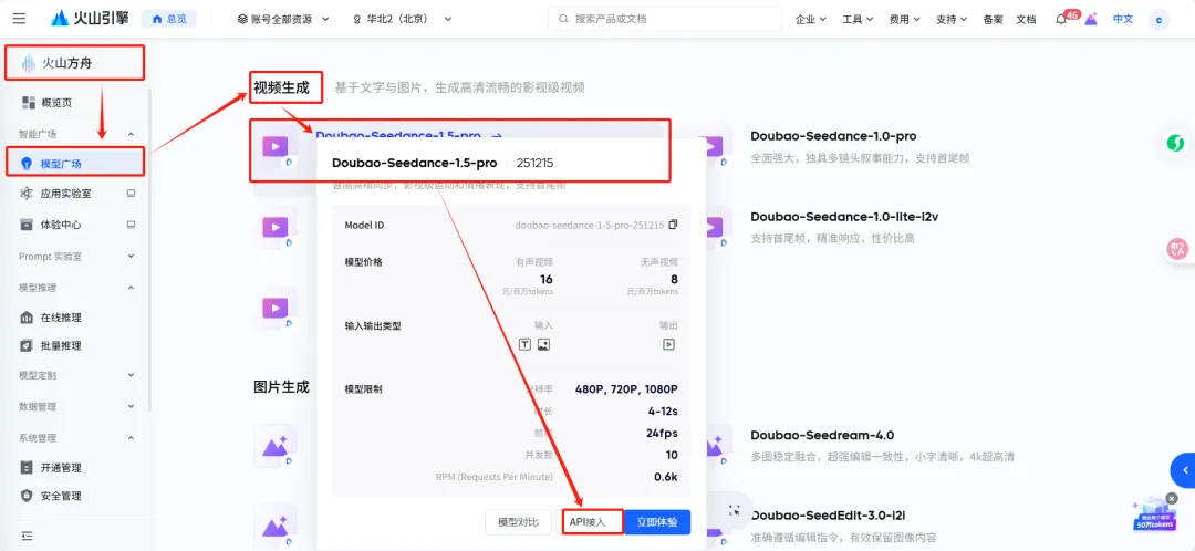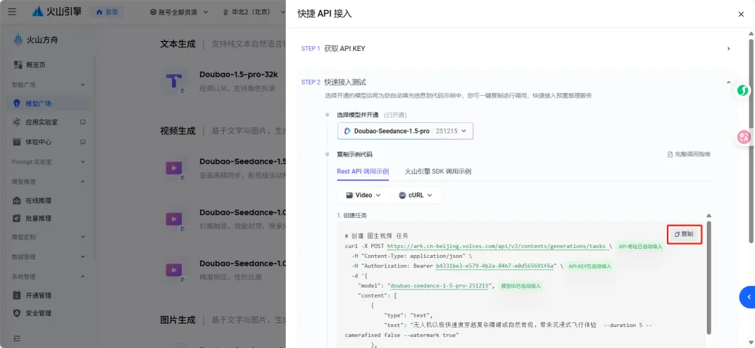 # 创建 图生视频 任务curl -X POST https://ark.cn-beijing.volces.com/api/v3/contents/generations/tasks \ -H "Content-Type: application/json" \ -H "Authorization: Bearer b4331be3-e579-4b2a-84b7-e0d565691f6a" \ -d '{ "model": "doubao-seedance-1-5-pro-251215", "content": [ { "type": "text", "text": "无人机以极快速度穿越复杂障碍或自然奇观,带来沉浸式飞行体验 --duration 5 --camerafixed false --watermark true" }, { "type": "image_url", "image_url": { "url": "https://ark-project.tos-cn-beijing.volces.com/doc_image/seepro_i2v.png" } } ]}'