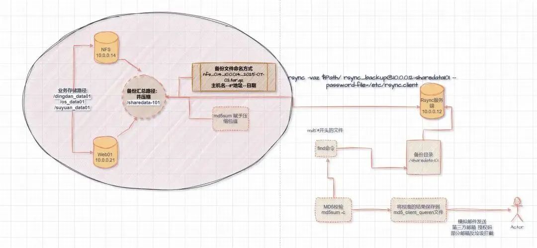 [[root@rsync-server_0.12[ /sharedata-101]# cat /scripts/rsync_server_huizong_jiaoyan.sh #/usr/bin/bash#1.定义变量Path=/sharedata-101Host=$(hostname)Addr=$(ifconfig eth1 |awk 'NR==2 {print $2}')Date=$(date +%F)#合并一个变量,大括号包裹的是变量,小括号包裹的是命令Dest=${Host}_${Addr}_${Date}#2.copy--->md5md5sum -c $(find /${Path}/ -type f -name "MD5_*") >> ${Path}/md5_client_queren#3.保留180天的备份数据find $Path/ -maxdepth 1 -type d -mtime +180 | xargs rm -f最后给予执行权限: