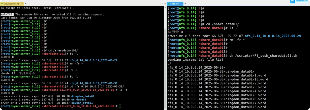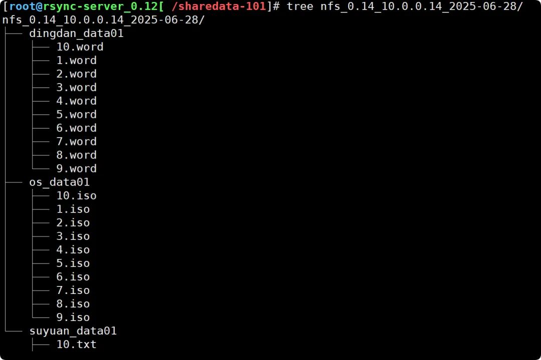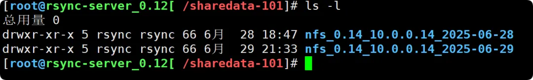 [root@rsync-server_0.12[ /] ll -ld /sharedata-101/drwxr-xr-x 2 rsync rsync 6 6月 28 18:59 /sharedata-101/[root@rsync-server_0.12[ /] systemctl restart rsyncd[root@rsync-server_0.12[ /] netstat -lntup | grep '873'tcp 0 0 0.0.0.0:873 0.0.0.0:* LISTEN 3101/rsync tcp6 0 0 :::873 :::* LISTEN 3101/rsync [root@rsync-server_0.12[ /]# [root@nfs_0.14[ /etc]# rsync -vaz /share_data01/ rsync_backup@10.0.0.12::sharedata101 --password-file=/etc/rsync.passwordsending incremental file list./nfs_0.14_10.0.0.14_2025-06-28/nfs_0.14_10.0.0.14_2025-06-28/dingdan_data01/nfs_0.14_10.0.0.14_2025-06-28/dingdan_data01/1.wordnfs_0.14_10.0.0.14_2025-06-28/dingdan_data01/10.word