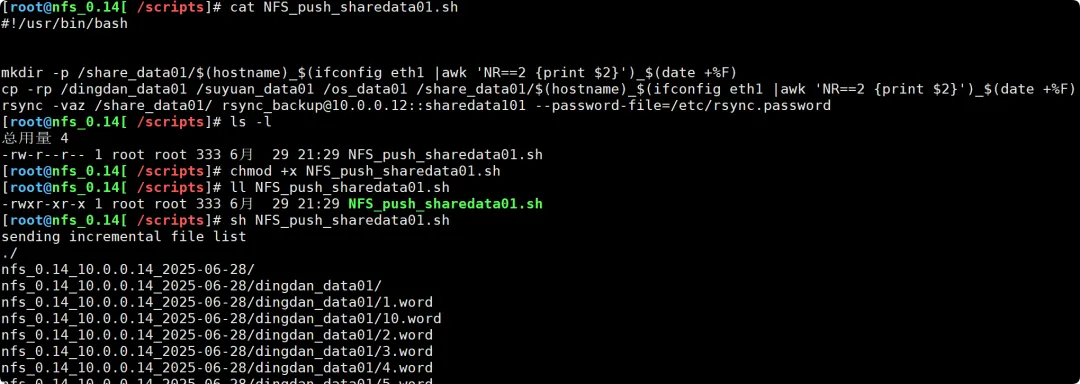 //客户端中编写一个脚本文件[root@nfs_0.14[ /scripts]# pwd/scripts[root@nfs_0.14[ /scripts] cat NFS_push_sharedata01.sh #!/usr/bin/bash//创建备份的目录mkdir -p /share_data01/$(hostname)_$(ifconfig eth1 |awk 'NR==2 {print $2}')_$(date +%F)//拷贝备份文件到备份目录之中cp -rp /dingdan_data01 /suyuan_data01 /os_data01 /share_data01/$(hostname)_$(ifconfig eth1 |awk 'NR==2 {print $2}')_$(date +%F)//推送备份数据到Rsync服务端rsync -vaz /share_data01/ rsync_backup@10.0.0.12::sharedata101 --password-file=/etc/rsync.password