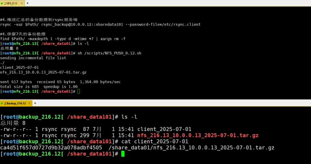 [root@nfs_216.13[ /share_data01] cat /scripts/NFS_PUSH_0.12.sh #!/usr/bin/bash#定义变量(首字母大小写,区分系统命令Path=/share_data01Host=$(hostname)Addr=$(ifconfig eth1 |awk 'NR==2 {print $2}')Date=$(date +%F)#合并一个变量,大括号包裹的是变量,小括号包裹的是命令Dest=${Host}_${Addr}_${Date}#1.创建备份的目录#mkdir -p $Path/$Dest#2.压缩不同业务数据的存储文件汇总到指定文件夹内-为后续md5校验做文件准备cd /tar czf $Path/${Dest}.tar.gz dingdan_data01/ os_data01/ suyuan_data01/#3.为客户端业务数据汇总的压缩包创建md5值md5sum $Path/*.tar.gz > $Path/client_${Date}#4.推送汇总的备份数据到rsync服务端rsync -vaz $Path/ rsync_backup@10.0.0.12::sharedata101 --password-file=/etc/rsync.client#4.保留7天的备份数据find $Path/ -maxdepth 1 -type d -mtime +7 | xargs rm -f最后给予执行权限: