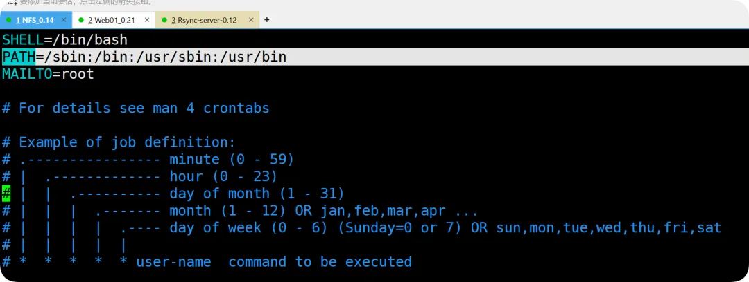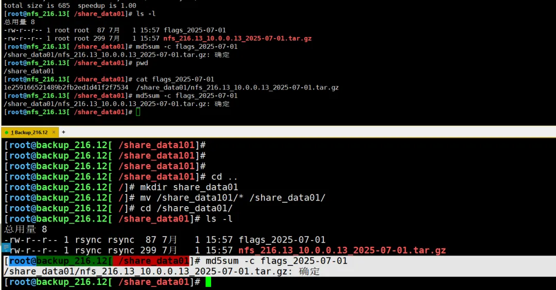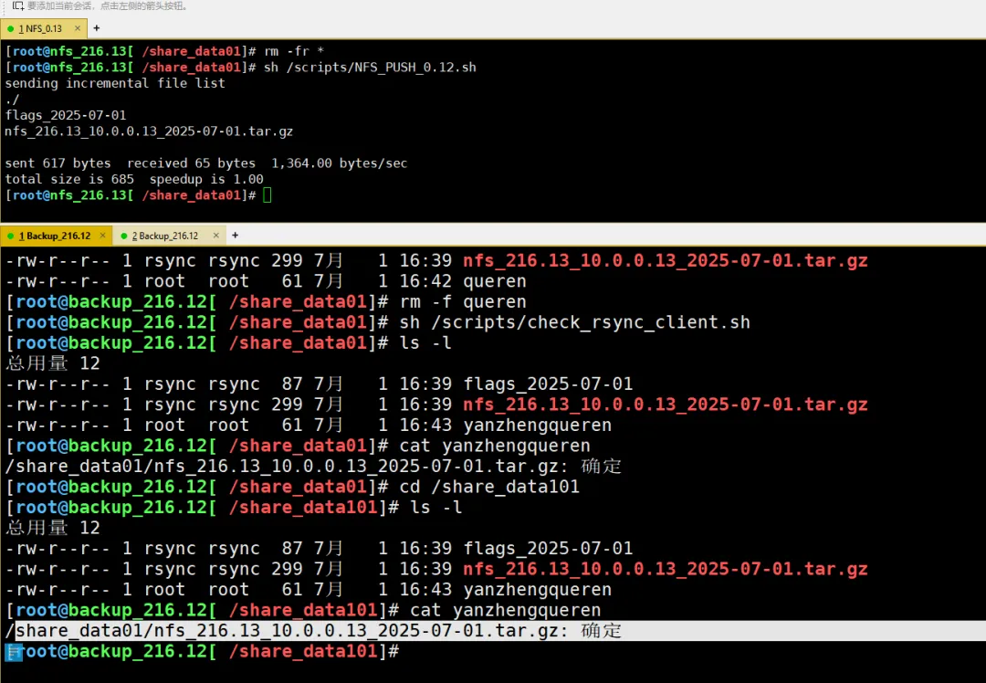 [root@nfs_0.14[ /share_data01]# cp -rp /dingdan_data01 /suyuan_data01 /os_data01 /share_data01/$(hostname)_$(ifconfig eth1 |awk 'NR==2 {print $2}')_$(date +%F)[root@nfs_0.14[ /share_data01]# ll /share_data01/nfs_0.14_10.0.0.14_2025-06-28/总用量 0drwxr-xr-x 2 root root 147 6月 28 18:38 dingdan_data01drwxr-xr-x 2 root root 137 6月 28 18:38 os_data01drwxr-xr-x 2 root root 137 6月 28 18:37 suyuan_data01[root@nfs_0.14[ /share_data01]# [root@rsync-server_0.12[ /linshi01]# cat /etc/rsyncd.confuid = rsyncgid = rsyncport = 873fake super = yesuse chroot = nomax connections = 200timeout = 600#ignore errorsread only = falselist = trueauth users = rsync_backupsecrets file = /etc/rsync.passwdlog file = /var/log/rsyncd.log####################################[linshi01]comment = “这是临时rsync的测试文件”path = /linshi01[sharedata101]comment = "这是NFS、Web01的业务数据"path = /sharedata101uid = rsyncgid = rsyncauth users = rsync_backup