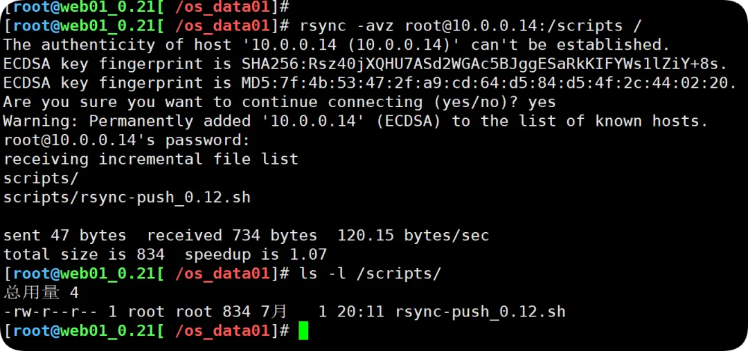 使用rsync远程传输模式将一台客户端根路径下的scripts文件夹下的文件传输到自己的根目录下:rsync -avz root@10.0.0.14:/scripts /