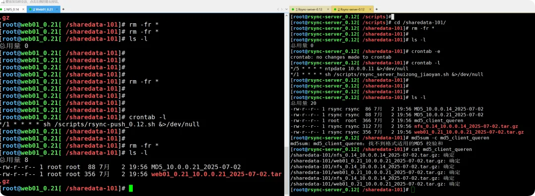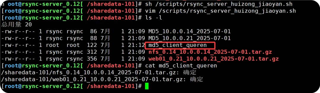 由于本次实验在规划中客户端汇总路径和服务端中rsync模块路径不一致,所以我踩了一个坑,在md5校验时候出现了问题,多了一步把文件和文件目录跟客户端保持一致的操作;