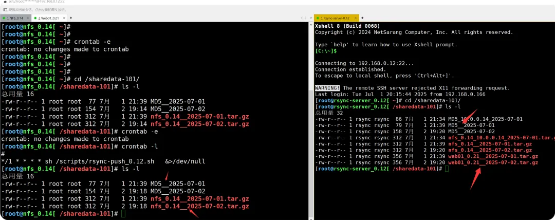 //两个客户端分别加入定时任务脚本(暂定每隔一分钟执行一次)[root@nfs_0.14[ /sharedata-101]# crontab -l*/1 * * * * sh /scripts/rsync-push_0.12.sh &>/dev/null