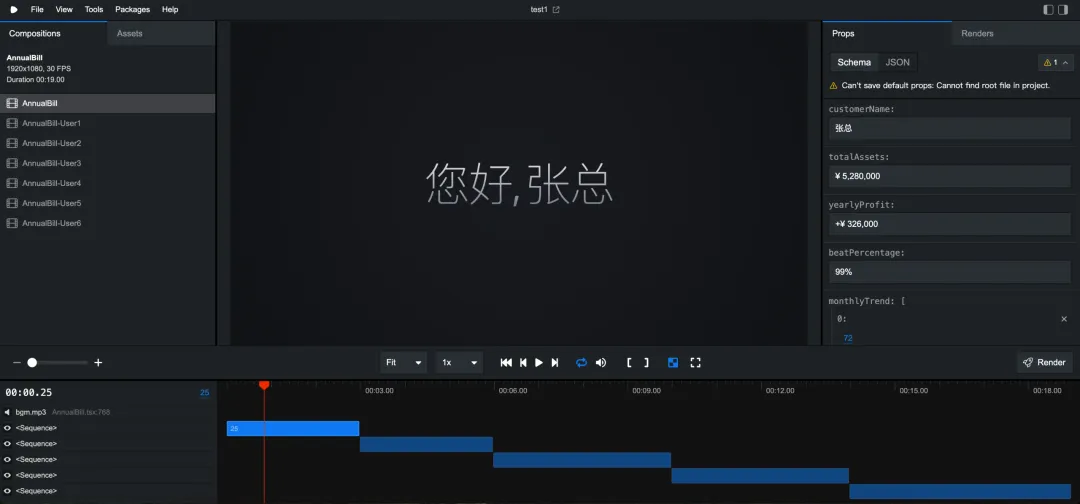 打开后是一个类似剪映的页面,叫做Remotion Studio,视频跑出来的那一刻,还是很舒服的。页面右下角点击Render,就会开始渲染和导出,导出mp4格式的视频。