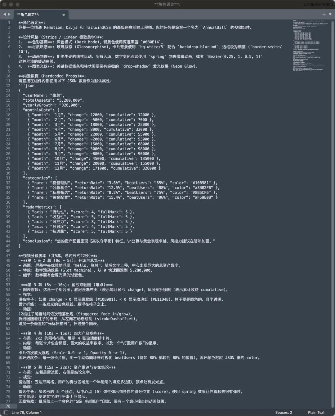 上面我们写了,在用remotion制作视频的过程中,AI助手还是充当着设计者、逻辑编写者的关键角色,所以提示词依然关键,决定着视频效果的成败,这是区别于nano banana的一个关键点。