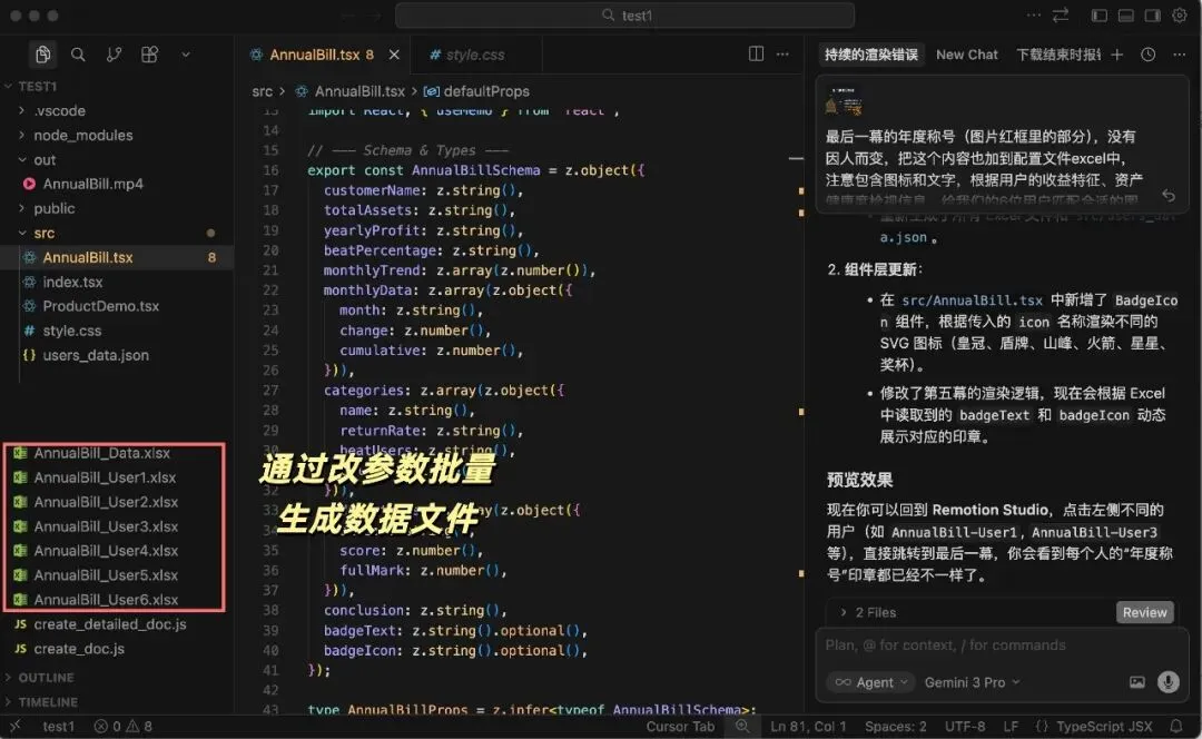 另外,我实际在做的时候,是一幕一幕输入给模型的,不是一股脑进去的,不知道remotion完成度咋样,也是第一次用skill,cursor里的模型我用的是gemini 3 flash。结果发现人家能力杠杠的,每一幕做的很快,细节美观度要微调,整体完成还是比较顺的,没有复杂的bug出现,意外好评!