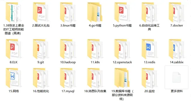 为了帮助大家早日快速入门云计算运维领域,给大家整理了一套【最新运维资料】高级运维工程师必备技能资料包(文末一键免费领取),内容有多详实丰富看下图!