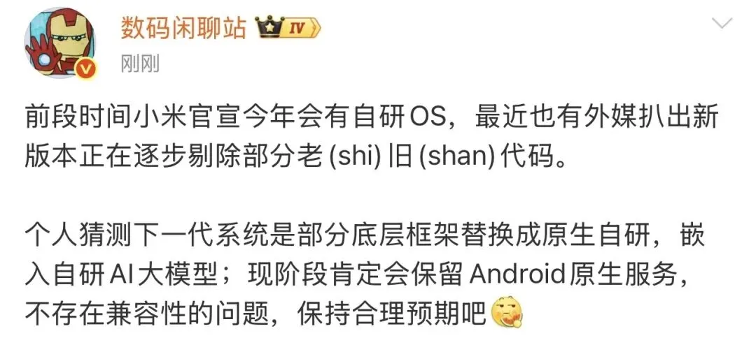 据大V博主消息,猜测小米下一代自研系统,底层框架会替换成自研OS,并嵌入自研AI大模型,剔除老(shi)旧(shan)代码。