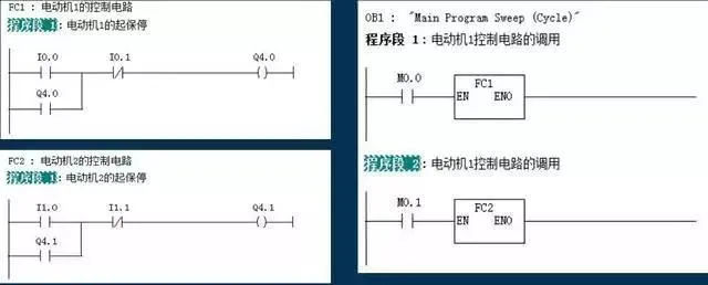 这是典型的起保停电路,采用模块化编程的思想,分别在FC1和FC2中编写电机的控制程序,在主程序OB1中进行FC1和FC2的调用。