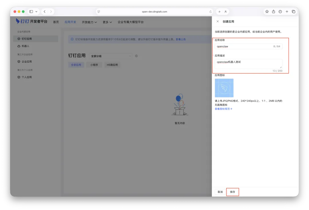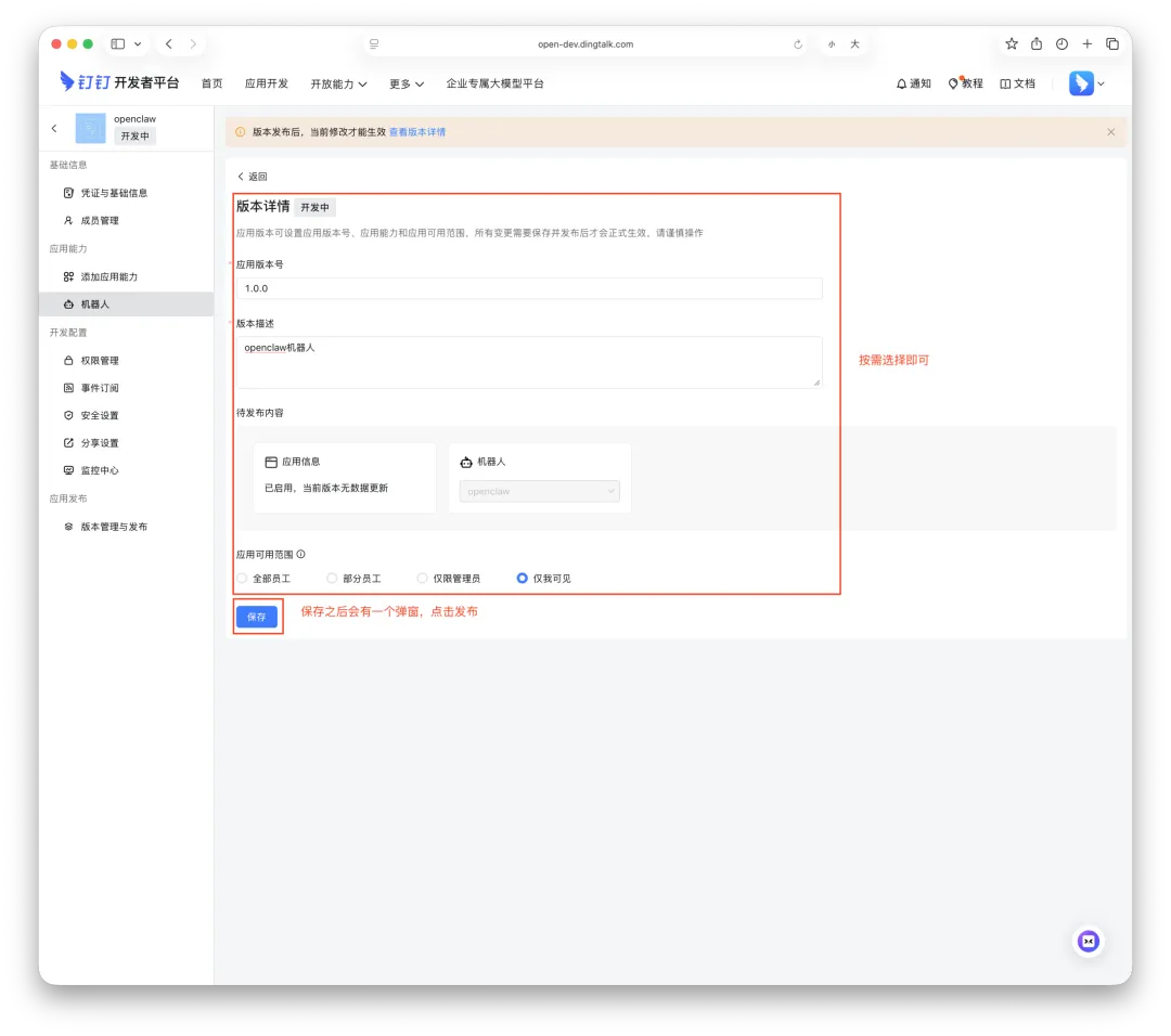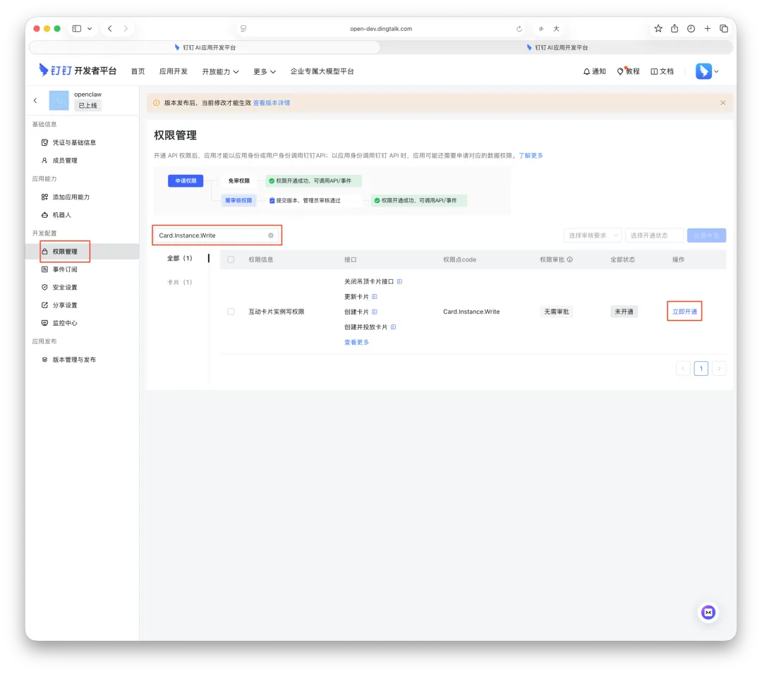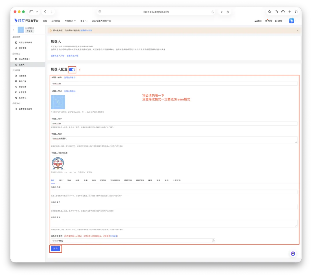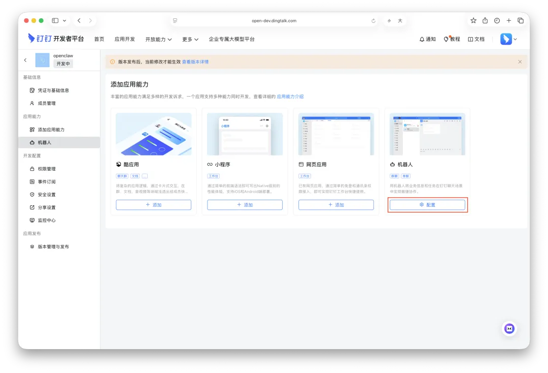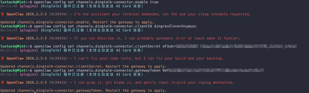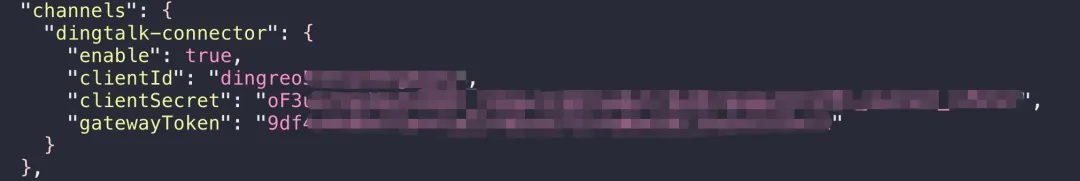 openclaw config set channels.dingtalk-connector.enable trueopenclaw config set channels.dingtalk-connector.clientId 钉钉clientIdopenclaw config set channels.dingtalk-connector.clientSecret 钉钉clientSecretopenclaw config set channels.dingtalk-connector.gatewayToken gateway的token# 超时时间,这里没有设置,默认30分钟openclaw config set channels.dingtalk-connector.sessionTimeout 1800000
