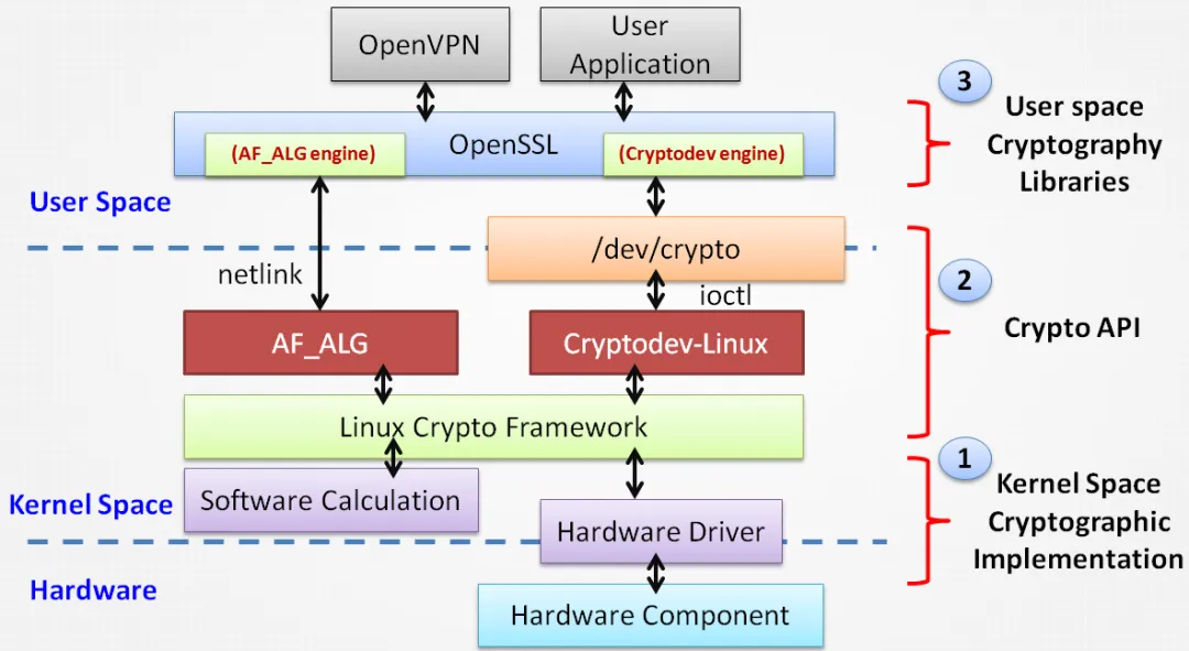 下图是以OpenSSL为例,展示了用户空间到内核空间的加密服务调用路径: