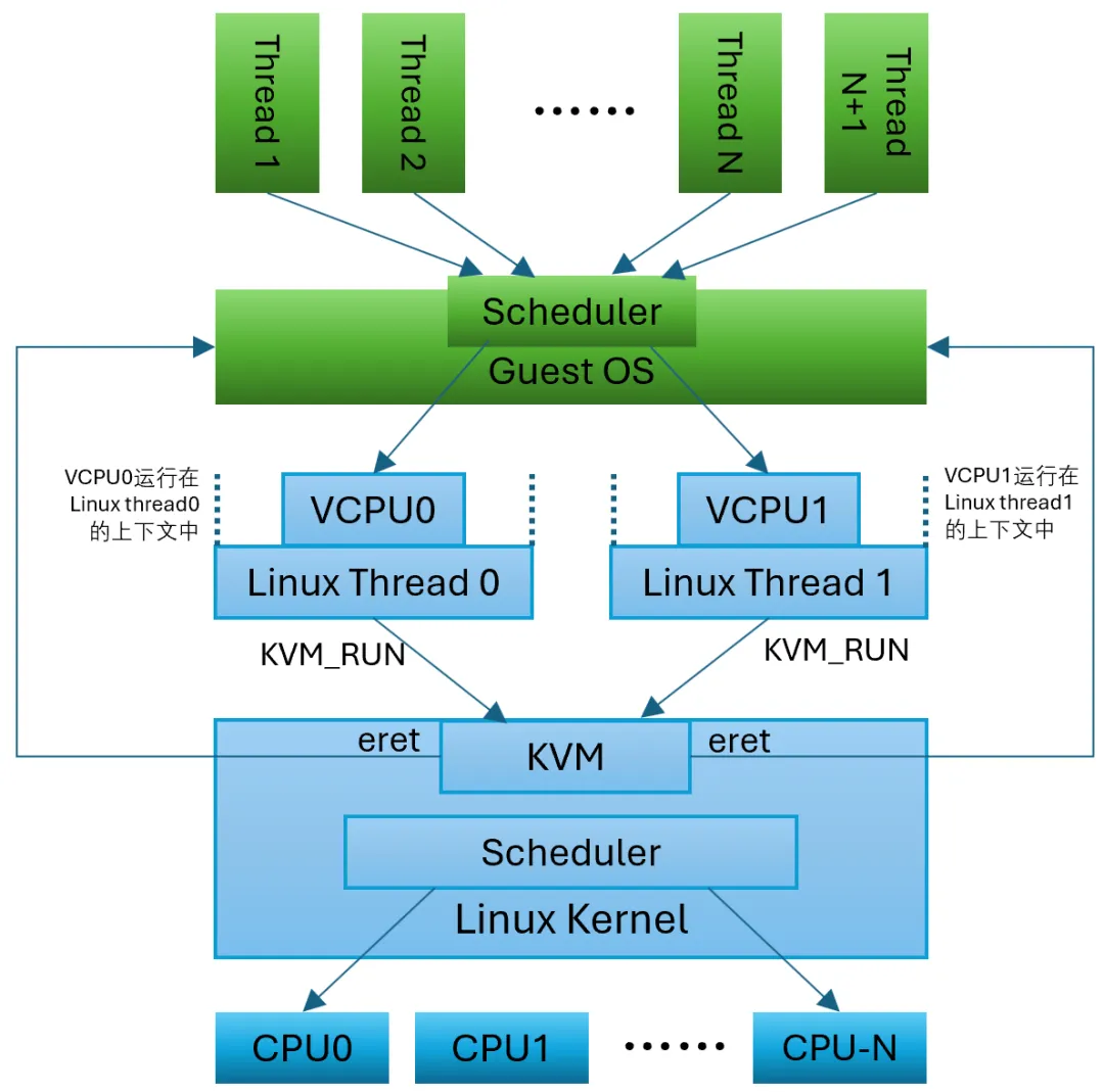 /*** VCPU thread function - each VCPU runs in its own thread*/void *vcpu_thread(void *arg){struct vcpu_data *vcpu = (struct vcpu_data *)arg;int ret;printf("[VCPU %d] Thread started\n", vcpu->vcpu_id);/* Repeatedly run code and handle VM exits. */bool shut_down = false;for (int i = 0; i < MAX_VM_RUNS && !shut_down; i++) {ret = ioctl(vcpu->vcpufd, KVM_RUN, NULL);if (ret < 0) {printf("[VCPU %d] System call 'KVM_RUN' failed: %d - %s\n", vcpu->vcpu_id, errno, strerror(errno));printf("[VCPU %d] Error Numbers: EINTR=%d; ENOEXEC=%d; ENOSYS=%d; EPERM=%d\n", vcpu->vcpu_id, EINTR, ENOEXEC, ENOSYS, EPERM);return NULL;}pthread_mutex_lock(&print_mutex);printf("\n[VCPU %d] KVM_RUN Loop %d:\n", vcpu->vcpu_id, i+1);switch (vcpu->run->exit_reason) {case KVM_EXIT_MMIO:printf("[VCPU %d] Exit Reason: KVM_EXIT_MMIO\n", vcpu->vcpu_id);if (mmio_exit_handler(vcpu)) {printf("[VCPU %d] Output complete, exiting loop\n", vcpu->vcpu_id);shut_down = true;}break;case KVM_EXIT_SYSTEM_EVENT:// This happens when the VCPU has done a HVC based PSCI call.printf("[VCPU %d] Exit Reason: KVM_EXIT_SYSTEM_EVENT\n", vcpu->vcpu_id);print_system_event_exit_reason(vcpu);shut_down = true;break;case KVM_EXIT_INTR:printf("[VCPU %d] Exit Reason: KVM_EXIT_INTR\n", vcpu->vcpu_id);i--; // Don't count this iterationbreak;case KVM_EXIT_FAIL_ENTRY:printf("[VCPU %d] Exit Reason: KVM_EXIT_FAIL_ENTRY\n", vcpu->vcpu_id);break;case KVM_EXIT_INTERNAL_ERROR:printf("[VCPU %d] Exit Reason: KVM_EXIT_INTERNAL_ERROR\n", vcpu->vcpu_id);break;default:printf("[VCPU %d] Exit Reason: other\n", vcpu->vcpu_id);}pthread_mutex_unlock(&print_mutex);}pthread_mutex_lock(&print_mutex);printf("\n[VCPU %d] VM MMIO Output:\n", vcpu->vcpu_id);for(int i = 0; i < vcpu->mmio_buffer_index; i++) {printf("%c", vcpu->mmio_buffer[i]);}printf("\n");printf("[VCPU %d] Thread finished\n", vcpu->vcpu_id);pthread_mutex_unlock(&print_mutex);return NULL;}