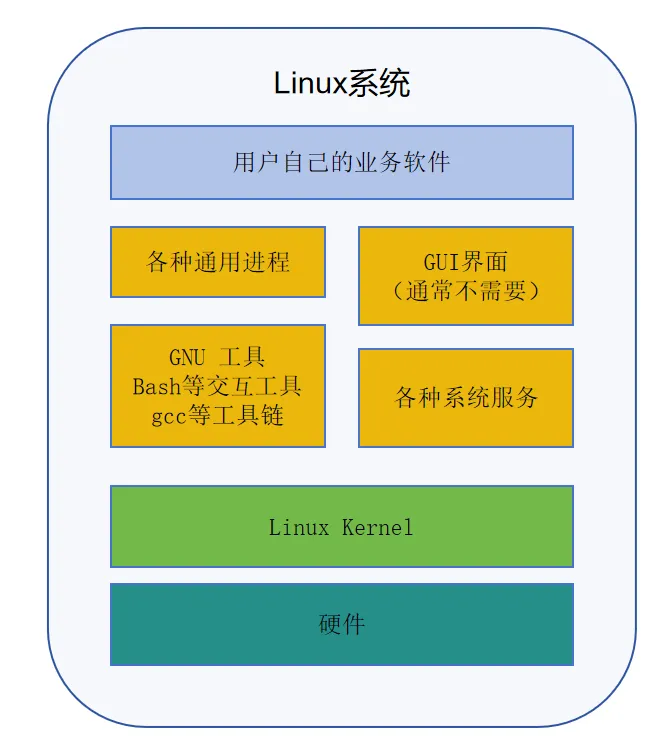 一个Linux系统是指运行Linux的一台设备,有大有小,可以是一个小的手环、录音笔,也可以是一个超大的服务器,比如nvidia的AI服务器。从软件角度定义,一个Linux系统是指围绕Linux内核构建的一个完整、可用的操作系统。- GNU工具集: 提供了绝大多数基本的命令行工具(如bash, grep, gcc, cp, rm等)。这正是为什么许多人(尤其是GNU项目)更倾向于称其为 “GNU/Linux系统” 的原因。