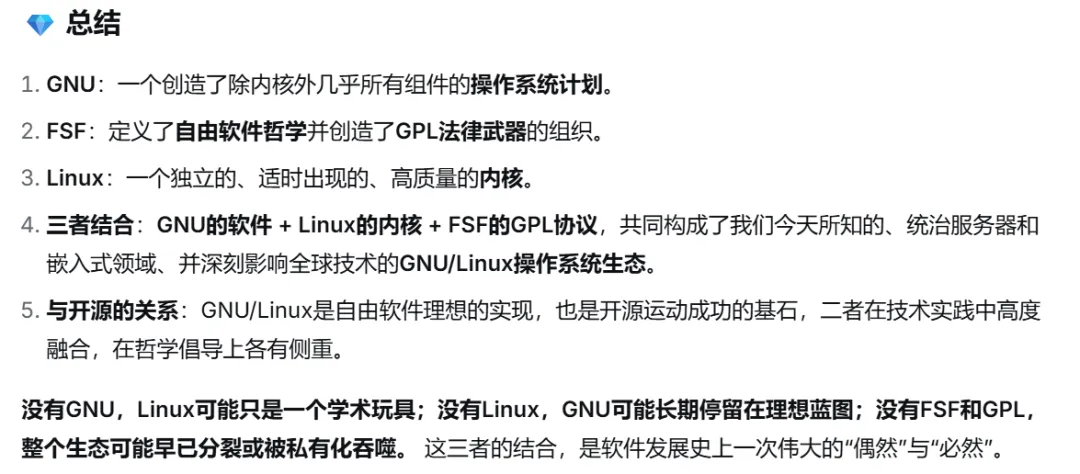 最早接触Linux的时候,有个很大的误区,以为Linux就代表了开源。后来才理解,Linux内核仅仅是开源社区的一个代表性贡献,实际上Linux能够运行,也依赖开源社区提供的其他大量工具和软件的支持,比如GNU,FSF等。下面是DeepSeek给出的GNU和FSF的介绍,及三者的关系:GNU 是GNU‘s Not Unix! 的递归缩写,是理查德·斯托曼在1983年发起的一个宏伟计划,目标是创建一个完全由自由软件构成的、类Unix的完整操作系统。核心成就:在1990年代初,GNU项目已经完成了几乎整个操作系统所需的所有关键工具和库,除了最核心的部分——内核。Glibc: GNU C语言标准库,几乎所有程序都依赖它。Bash: 功能强大的命令行解释器(Shell)。Coreutils: 包含ls, cp, cat等所有基础命令行工具。FSF是自由软件基金会,由斯托曼于1985年创立。它是GNU计划的指导、管理和法律支持机构。主要贡献有:哲学定义:提出了“自由软件”的严格哲学,强调用户有运行、学习、修改和分发软件的自由(四大自由)。法律武器:创造了GNU通用公共许可证,即著名的GPL。这是一个“著佐权”许可证,确保任何基于GPL软件衍生的作品也必须以GPL发布,从而在法律上保障了软件的自由属性能够传递下去。【说明】基于Linux软件开发的都知道GPL License,就是这个许可证保证了对Linux内核本身的修改或与之静态链接的衍生作品,在分发时必须开源。Linux是由林纳斯·托瓦兹于1991年独立发起的一个类Unix的操作系统内核项目。它本身不是GNU计划的一部分。历史性结合:当Linux内核开发出来后,人们发现,将GNU项目已经完成的海量工具、编译器和库,与Linux内核组合在一起,就形成了一个完整、可用的操作系统。这是技术与历史的偶然,也是自由软件理念的必然结果。为什么说Linux内核是宏内核?