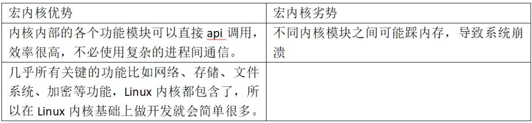 宏内核是一种操作系统内核的设计范式,其核心思想是:l将操作系统的核心功能(如进程管理、内存管理、文件系统、设备驱动、网络协议栈等)全部运行在内核空间(Kernel Space)的一个单一、大的可执行模块中。l系统启动时或运行时可以动态加载/卸载内核模块(Loadable Kernel Modules, LKM),但这些模块一旦加载,就运行在内核态。Linux 内核是宏内核,因为它将操作系统的主要功能(调度、内存、文件系统、网络、驱动等)全部实现在内核空间,通过高效的函数调用协作,而非依赖用户态服务和消息传递。【说明】Linux内核的所有核心组件和加载的内核模块都在同一个地址空间运行是非常重要的概念,意味着各种内核软件彼此都可以看到,各个软件的特权级别是一样的。也就意味着,非常重要的内核调度、文件系统、网络模块等,与小白开发的任何一个内核模块,都是在一个地址空间。如果小白开发的内核模块有问题,就可能出现“踩内存”(非法内存访问)的情况,会导致整个Linux系统崩溃,也就是kernel panic的情况。这是宏内核的最大问题,所以内核模块的开发一定要非常小心,非必要不要在内核态进行开发,最好都在用户态进行开发,使用stable的内核版本,减少改动。宏内核的最大好处也是同一地址空间带来的,下图总结了Linux宏内核的优势和劣势:Linux内核介绍
