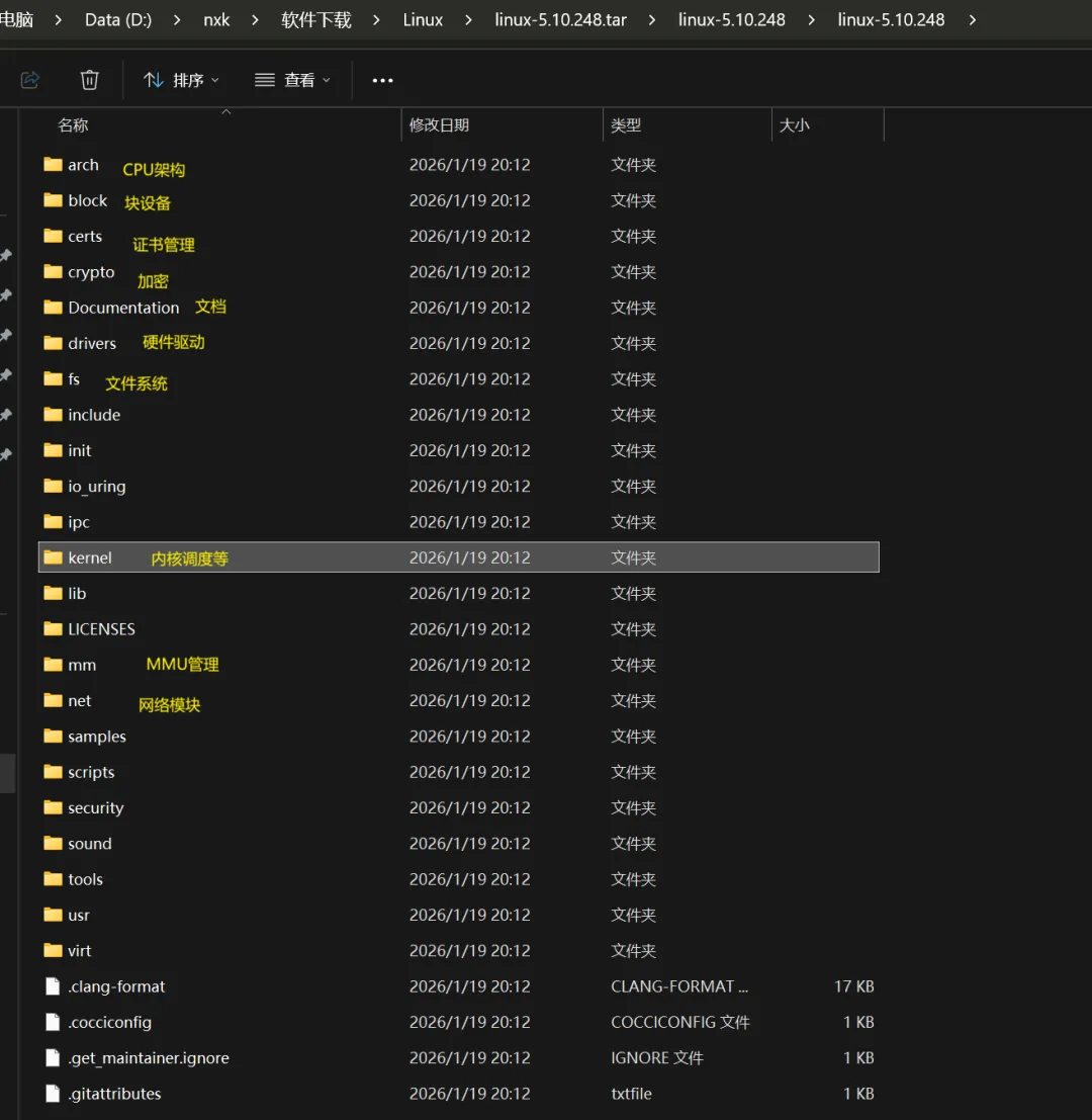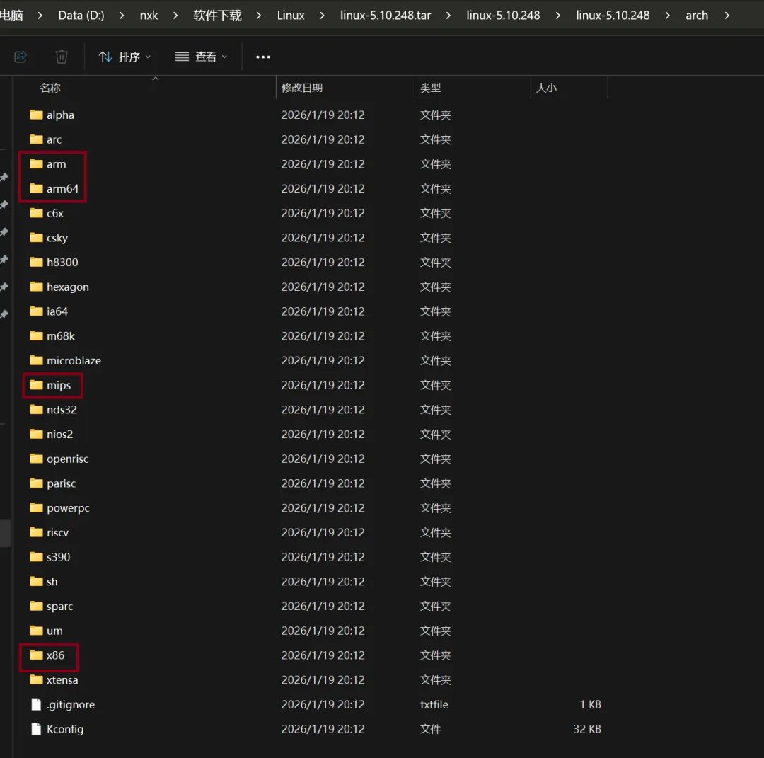 下面是网站主页,红色框的longterm版本是开发首选版本,如果不需要新版本的功能,尽量选择不太新的版本更安全,但也不能太旧,以免软件兼容性有问题。【注意】在Linux下,文件名是分大小写的,而Windows下文件名是不分大小写的,所以下载的tar包如果是Windows下解压会有一些报错,只能大概看看,只有Linux系统下查看才是完整的。Linux内核对CPU架构的支持是非常丰富的,打开arch目录就是Linux支持的各种处理器架构,我们常用的用红框标识,如下图:Linux内核是怎么对外提供服务的?下次再接着写。
