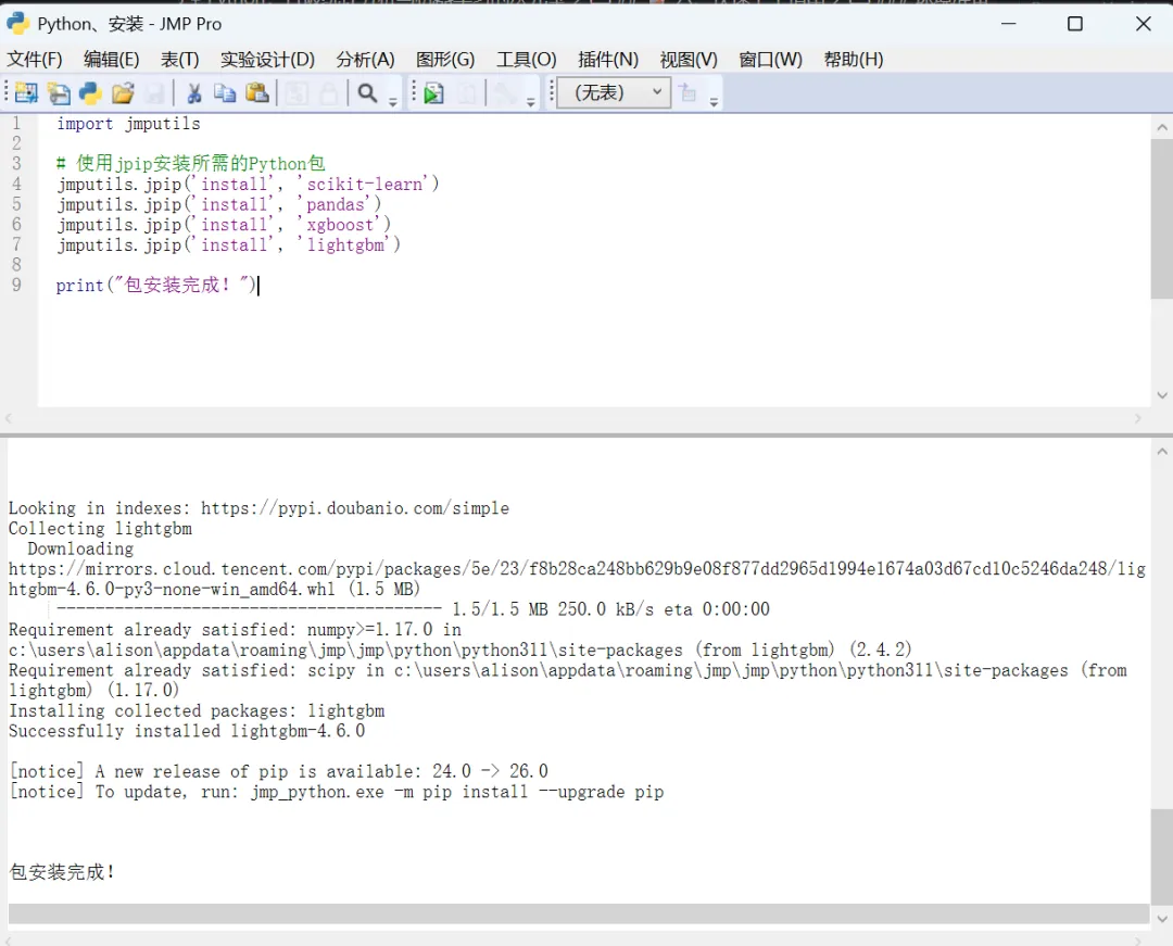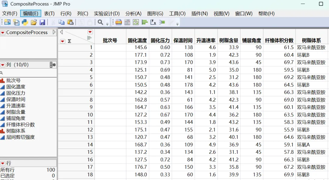 // CompositeProcess 模拟数据生成脚本// 在JMP中运行此脚本,将创建一个包含100条模拟数据的数据表Names Default To Here(1);Random Seed(42); // 固定随机种子,确保结果可重复n = 100; // 数据条数// 创建数据表dt = New Table("CompositeProcess", // 工艺参数列 New Column("批次号", Character, Set Values(Char(1::n))), New Column("固化温度", Numeric, Format("Fixed Dec", 12, 1), Set Values(J(n, 1, Random Uniform(120, 180)))), New Column("固化压力", Numeric, Format("Fixed Dec", 12, 2), Set Values(J(n, 1, Random Uniform(0.3, 0.8)))), New Column("保温时间", Numeric, Format("Fixed Dec", 12, 0), Set Values(J(n, 1, Random Uniform(60, 180)))), New Column("升温速率", Numeric, Format("Fixed Dec", 12, 1), Set Values(J(n, 1, Random Uniform(1, 5)))), New Column("树脂含量", Numeric, Format("Fixed Dec", 12, 1), Set Values(J(n, 1, Random Uniform(30, 45)))), New Column("铺层角度", Numeric, Set Values(J(n, 1, Random Integer(1, 4)) * 45)), New Column("纤维体积分数", Numeric, Format("Fixed Dec", 12, 1), Set Values(J(n, 1, Random Uniform(55, 70)))), New Column("树脂体系", Character, Set Values({"环氧A", "环氧B", "双马来酰亚胺"}[J(n, 1, Random Integer(1, 3))])));// 计算层间剪切强度(ILSS)- 模拟真实的非线性关系层间剪切强度 = J(n, 1, 0);For(i = 1, i <= n, i++, temp = dt:固化温度[i]; press = dt:固化压力[i]; time = dt:保温时间[i]; rate = dt:升温速率[i]; resin = dt:树脂含量[i]; fiber = dt:纤维体积分数[i]; // 基础模型:主效应 + 交互效应 + 非线性项 base = 35; // 主效应(线性) main = 0.15 * temp + 25 * press + 0.03 * time + 0.8 * resin + 0.3 * fiber - 0.5 * rate; // 关键交互效应:温度 × 保温时间 interaction = 0.0008 * temp * time; // 非线性项:最优温度在150°C左右 nonlinear = -0.003 * (temp - 150)^2; // 随机噪声 noise = Random Normal() * 2.5; // 最终强度值 层间剪切强度[i] = base + main + interaction + nonlinear + noise;);// 添加层间剪切强度列dt << New Column("层间剪切强度", Numeric, Format("Fixed Dec", 12, 2), Set Values(层间剪切强度));// 提示Print("✅ CompositeProcess 数据表已创建!");Print(" - 共 " || Char(n) || " 条数据");Print(" - 包含 7 个工艺参数和 1 个响应变量");Print(" - 现在可以运行文章中的分析代码了");
