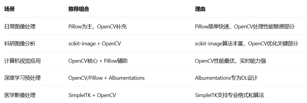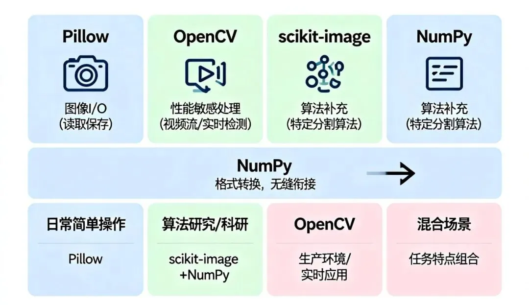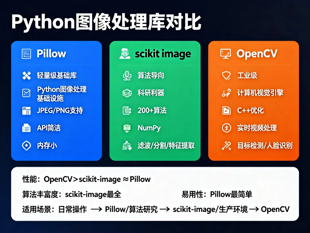 适用场景:日常操作→Pillow,算法研究→scikit-image,生产环境→OpenCV