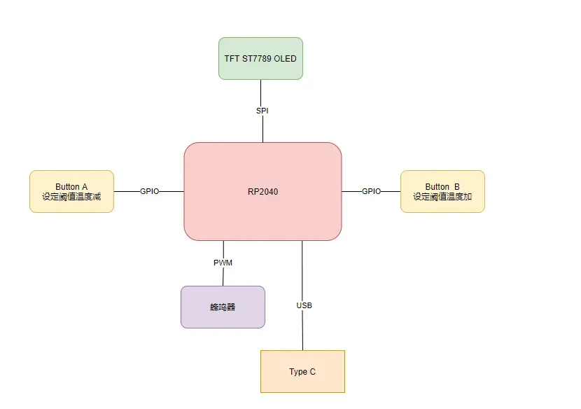 温度计早已不再只是简单的数值显示。在本项目中,我们基于 RP2040 嵌入式系统学习平台,通过 MicroPython 编程,结合 ST7789 SPI 彩屏、按键、蜂鸣器,制作了一个具备图形化界面和超温报警功能的“智能温度计”。当温度超过设定阈值时,蜂鸣器会鸣响并在屏幕上实时以红色提示,低于阈值则恢复绿色显示,直观而生动。这个项目不仅让你掌握 按键去抖与事件回调、ADC温度采集、PWM 蜂鸣器驱动、ST7789图形界面绘制等关键技能,还能锻炼完整的嵌入式系统设计思路。1)按键A\B设置报警温度增加 、减少;