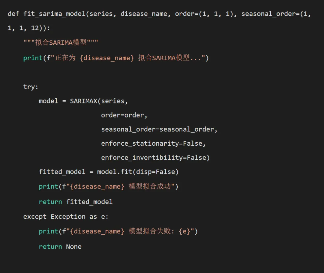import osimport pandas as pdimport numpy as npfrom datetime import datetime, timedeltaimport matplotlib.pyplot as pltimport seaborn as snsfrom statsmodels.tsa.statespace.sarimax import SARIMAXfrom statsmodels.tsa.seasonal import seasonal_decomposefrom statsmodels.tsa.stattools import adfullerfrom sklearn.metrics import mean_absolute_error, mean_squared_errorimport warningswarnings.filterwarnings('ignore')def get_desktop_path():"""获取桌面路径"""return os.path.join(os.path.expanduser("~"), "Desktop")def create_results_folder():"""创建结果文件夹""" desktop_path = get_desktop_path() results_path = os.path.join(desktop_path, "Results时间SARIMA")# 创建主文件夹和子文件夹 folders = [ results_path, os.path.join(results_path, "Models"), os.path.join(results_path, "Predictions"), os.path.join(results_path, "Diagnostics"), os.path.join(results_path, "Seasonal_Plots"), os.path.join(results_path, "Summary_Reports") ]for folder in folders:if not os.path.exists(folder): os.makedirs(folder)print(f"创建文件夹: {folder}")return results_pathdef load_and_prepare_data(results_path):"""加载和准备数据"""print("正在加载数据...")# 尝试读取R生成的数据 try: data_path = os.path.join(get_desktop_path(), "Results", "combined_weather_disease_data.csv") combined_data = pd.read_csv(data_path) combined_data['timestamp'] = pd.to_datetime(combined_data['timestamp'])print(f"成功读取数据,共{len(combined_data)}行")return combined_data except FileNotFoundError:print("未找到R生成的数据文件,生成模拟数据...")return generate_sample_data()def generate_sample_data():"""生成示例数据(如果R数据不存在)""" dates = pd.date_range('1981-01-01', '2025-12-31', freq='D')# 生成模拟疾病数据 np.random.seed(42) n = len(dates) data = {'timestamp': dates,'year': dates.year,'month': dates.month,'day': dates.day, }# 生成季节性疾病数据 t = np.arange(n)# 流感 - 冬季高发 data['influenza'] = np.round( 50 + 30 * np.sin(2 * np.pi * (t - 10) / 365) + # 冬季高峰 10 * np.sin(2 * np.pi * (t - 200) / 365) + # 夏季小高峰 np.random.normal(0, 5, n) ).clip(0)# 手足口病 - 春夏季高发 data['hand_foot_mouth'] = np.round( 30 + 20 * np.sin(2 * np.pi * (t - 150) / 365) + # 春夏季高峰 8 * np.sin(2 * np.pi * (t - 330) / 365) + # 秋季小高峰 np.random.normal(0, 3, n) ).clip(0)# 细菌性痢疾 - 夏季高发 data['bacillary_dysentery'] = np.round( 25 + 15 * np.sin(2 * np.pi * (t - 180) / 365) + # 夏季高峰 np.random.normal(0, 4, n) ).clip(0)# 流行性出血热 - 春秋季高发 data['hemorrhagic_fever'] = np.round( 20 + 12 * np.sin(2 * np.pi * (t - 80) / 365) + # 春季高峰 10 * np.sin(2 * np.pi * (t - 280) / 365) + # 秋季高峰 np.random.normal(0, 2, n) ).clip(0)return pd.DataFrame(data)def prepare_monthly_data(daily_data, disease_columns):"""将日数据转换为月数据""" monthly_data = daily_data.set_index('timestamp').resample('M')[disease_columns].sum().reset_index() monthly_data['year'] = monthly_data['timestamp'].dt.year monthly_data['month'] = monthly_data['timestamp'].dt.monthreturn monthly_data