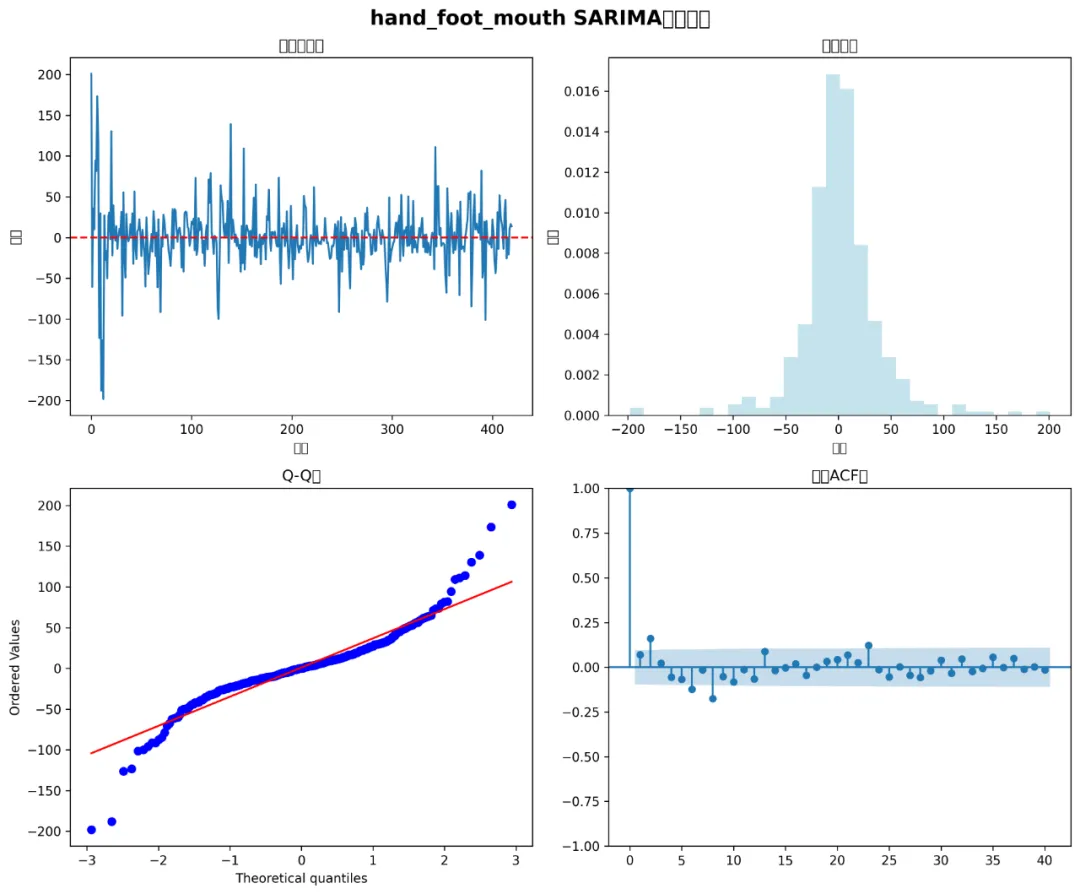 def create_diagnostic_plots(model, disease_name, results_path):"""创建模型诊断图"""if model is None:return# 残差分析 residuals = model.resid fig, ((ax1, ax2), (ax3, ax4)) = plt.subplots(2, 2, figsize=(12, 10))# 残差时序图 ax1.plot(residuals) ax1.set_title('残差时序图') ax1.set_xlabel('时间') ax1.set_ylabel('残差') ax1.axhline(y=0, color='r', linestyle='--')# 残差直方图 ax2.hist(residuals, bins=30, density=True, alpha=0.7, color='lightblue') ax2.set_title('残差分布') ax2.set_xlabel('残差') ax2.set_ylabel('密度')# Q-Q图 from scipy import stats stats.probplot(residuals, dist="norm", plot=ax3) ax3.set_title('Q-Q图')# ACF图 from statsmodels.graphics.tsaplots import plot_acf plot_acf(residuals, ax=ax4, lags=40) ax4.set_title('残差ACF图') plt.suptitle(f'{disease_name} SARIMA模型诊断', fontsize=16, fontweight='bold') plt.tight_layout()# 保存图片 plot_path = os.path.join(results_path, "Diagnostics", f"SARIMA_Diagnostics_{disease_name}.png") plt.savefig(plot_path, dpi=300, bbox_inches='tight') plt.close()print(f"诊断图已保存: {plot_path}")def main():"""主函数"""print("开始SARIMA建模分析...")# 创建结果文件夹 results_path = create_results_folder()print(f"结果将保存到: {results_path}")# 加载数据 combined_data = load_and_prepare_data(results_path)# 选择分析的疾病 selected_diseases = ["influenza", # 流感"hand_foot_mouth", # 手足口病"bacillary_dysentery", # 细菌性痢疾"hemorrhagic_fever"# 流行性出血热 ]# 准备月度数据 monthly_data = prepare_monthly_data(combined_data, selected_diseases)# 划分训练集和测试集 train_data = monthly_data[monthly_data['timestamp'] < '2016-01-01'] test_data = monthly_data[monthly_data['timestamp'] >= '2016-01-01']print(f"训练集: {len(train_data)} 个月 (1981-2015)")print(f"测试集: {len(test_data)} 个月 (2016-2025)")# 存储结果 all_results = {} accuracy_summary = []# 为每种疾病拟合模型for disease in selected_diseases:print(f"\n{'=' * 50}")print(f"处理疾病: {disease}")print(f"{'=' * 50}")# 拟合SARIMA模型 model = fit_sarima_model(train_data[disease], disease)if model is not None:# 预测和评估 results = forecast_and_evaluate(model, test_data, disease)if results is not None: all_results[disease] = {'model': model,'results': results }# 创建可视化 create_forecast_plot(monthly_data, train_data, test_data, results, disease, results_path) create_seasonal_plots(combined_data, disease, results_path) create_diagnostic_plots(model, disease, results_path)# 保存精度结果 accuracy_summary.append({'Disease': disease,'MAE': round(results['mae'], 2),'RMSE': round(results['rmse'], 2),'MAPE': round(results['mape'], 2) })# 保存预测结果 forecast_df = pd.DataFrame({'date': test_data['timestamp'],'actual': results['actual'],'predicted': results['predicted'],'lower_95': results['lower_95'],'upper_95': results['upper_95'] }) forecast_path = os.path.join(results_path, "Predictions", f"SARIMA_Predictions_{disease}.csv") forecast_df.to_csv(forecast_path, index=False)print(f"预测结果已保存: {forecast_path}")# 生成汇总报告if accuracy_summary:# 精度汇总 accuracy_df = pd.DataFrame(accuracy_summary) accuracy_path = os.path.join(results_path, "Summary_Reports", "accuracy_summary.csv") accuracy_df.to_csv(accuracy_path, index=False)# 创建精度比较图 plt.figure(figsize=(10, 6)) bars = plt.bar(accuracy_df['Disease'], accuracy_df['MAPE'], alpha=0.7) plt.title('SARIMA模型预测精度比较 (MAPE%)', fontsize=14, fontweight='bold') plt.xlabel('疾病类型') plt.ylabel('平均绝对百分比误差 (%)') plt.xticks(rotation=45)# 在柱子上添加数值for bar, mape in zip(bars, accuracy_df['MAPE']): plt.text(bar.get_x() + bar.get_width() / 2, bar.get_height() + 0.5, f'{mape:.1f}%', ha='center', va='bottom') plt.tight_layout() accuracy_plot_path = os.path.join(results_path, "Summary_Reports", "accuracy_comparison.png") plt.savefig(accuracy_plot_path, dpi=300, bbox_inches='tight') plt.close()print(f"\n精度汇总已保存: {accuracy_path}")print(f"精度比较图已保存: {accuracy_plot_path}")# 显示汇总结果print("\n" + "=" * 60)print("SARIMA建模分析完成!")print("=" * 60)print(f"成功分析的疾病: {list(all_results.keys())}")print(f"\n模型性能摘要:")print(accuracy_df.to_string(index=False))else:print("\n警告: 没有成功拟合任何模型!")print(f"\n所有结果已保存到: {results_path}")if __name__ == "__main__": main()