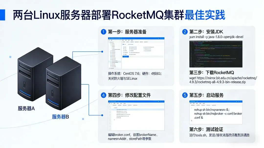 在分布式系统中,消息中间件不仅是解耦与异步通信的桥梁,更是保障系统稳定性与可扩展性的关键基础设施。Apache RocketMQ凭借其金融级可靠性、万亿级消息吞吐能力和成熟的主从架构,已成为众多企业构建核心消息平台的首选。然而,单机部署虽便于测试,却无法满足生产环境对高可用、容灾与负载均衡的基本要求。如何在有限的资源下(如2–4台普通Linux服务器),搭建一个结构清晰、配置合理、易于运维的RocketMQ高可用集群,是许多团队面临的现实挑战。本文聚焦 “轻量但不简陋” 的集群部署理念,摒弃过度复杂的架构,围绕双主双从(2m-2s-sync) 这一兼顾可靠性与资源效率的经典模式,手把手带你完成: