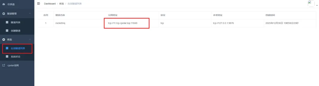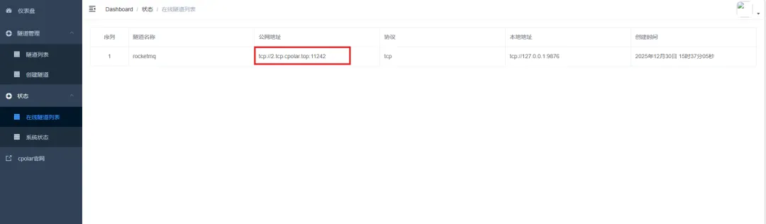 创建完成后,打开在线隧道列表,此时可以看到随机的公网地址已经发生变化,地址名称也变成了保留和固定的TCP地址。