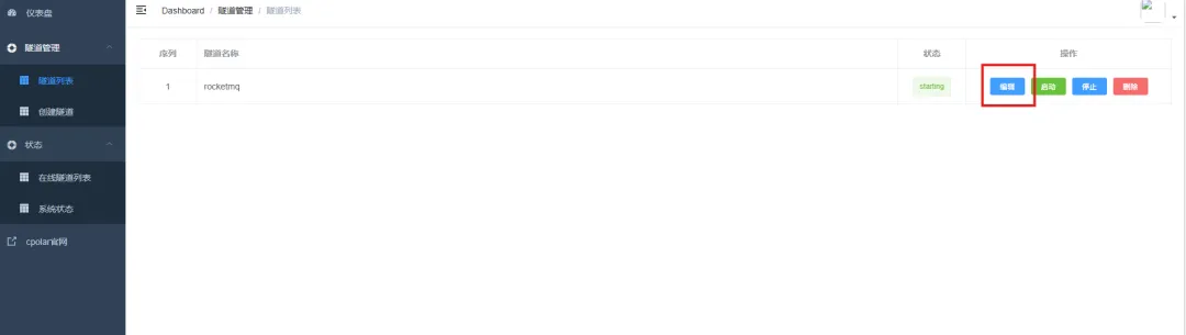 登录cpolar web UI管理界面,点击左侧仪表盘的隧道管理——隧道列表,找到所要配置的隧道rocketmq,点击右侧的编辑。