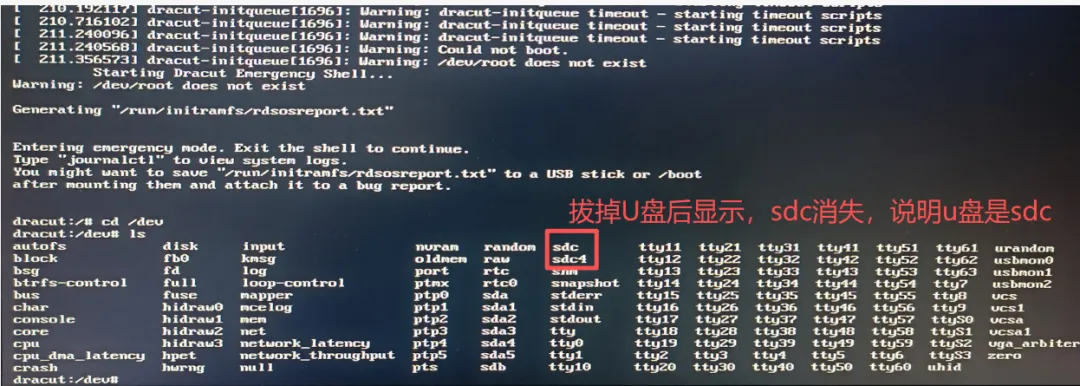 #执行如下命令dracut:/# ls /dev#此时拔掉U盘dracut:/# ls /dev#发现sdc 是U盘盘符