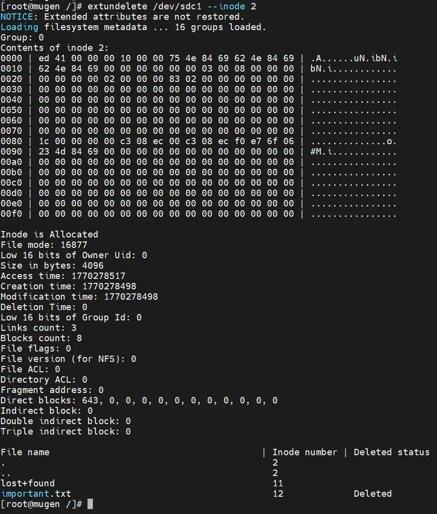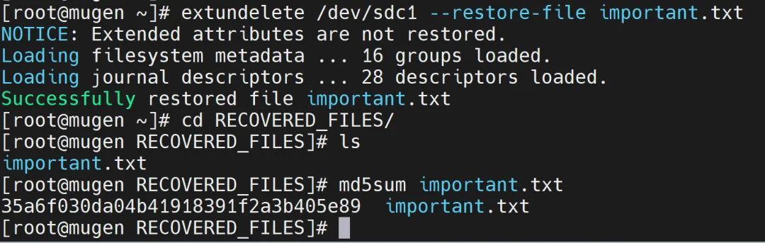 执行这个命令后,extundelete 会在/dev/sdc1分区中查找被删除的important.txt文件,并尝试恢复。恢复成功后,文件会保存在当前目录下的RECOVERED_FILES文件夹中 。这里需要注意,命令中的--restore-file参数后面跟的是文件的相对路径,也就是相对于文件系统根目录的路径,而不是绝对路径。