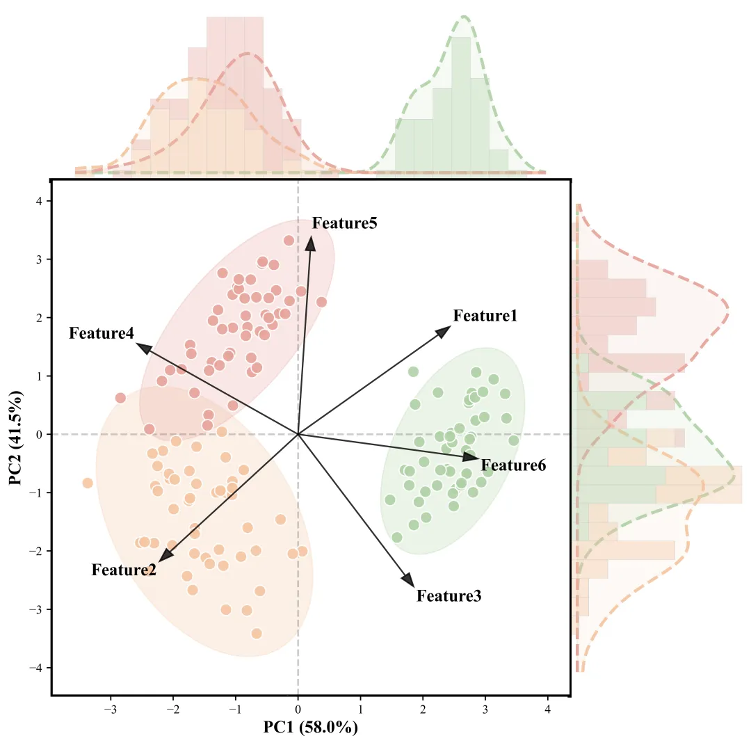 import pandas as pdimport numpy as npimport matplotlib.pyplot as pltfrom sklearn.decomposition import PCAfrom sklearn.preprocessing import StandardScalerfrom matplotlib.patches import Ellipsefrom matplotlib.gridspec import GridSpecfrom scipy.stats import gaussian_kde, chi2plt.rcParams['font.family'] = 'Times New Roman'# 文件路径CSV_FILE = "pca_data.csv"OUT_FIG = "pca_plot.png"# 数据生成核心参数RANDOM_SEED = 42N_PER_GROUP = 50NOISE_STD = 0.2# 真实载荷矩阵(核心)TRUE_LOADINGS = np.array([ [-0.9, 0.0], [0.8, 0.1], [0.3, 0.9], [0.1, -0.9], [-0.7, -0.6], [-0.5, 0.7]])# 组配置(核心)GROUP_CONFIGS = { "Group1": {"center": [-3, 3], "scale": [1.2, 0.8]}, "Group2": {"center": [3, -1], "scale": [0.9, 1.5]}, "Group3": {"center": [-1, -4], "scale": [1.5, 0.7]},}# 基础列名与颜色FEATURE_COLS = [f"Feature{i}" for i in range(1, 7)]GROUP_COL = "Group"COLORS = ["#b0d1a6", "#f5c5a0", "#e7a39a"]# 图形核心参数(删减边缘图、箭头等次要参数)FIGSIZE = (10, 10)GS_NROWS, GS_NCOLS = 4, 4SCATTER_S = 90SCATTER_ALPHA = 0.9ELLIPSE_ALPHA = 0.2502