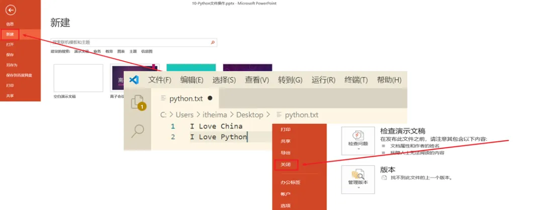 # 1、 打开文件f = open('python.txt', 'w', encoding='utf-8')# 2、写入内容f.write('人生苦短,我学python')# 3、关闭文件f.close()