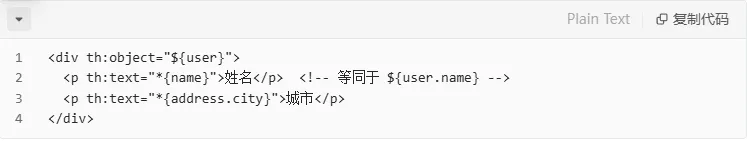 与变量表达式类似,但作用于通过 th:object 选定的对象,而不是整个上下文。
