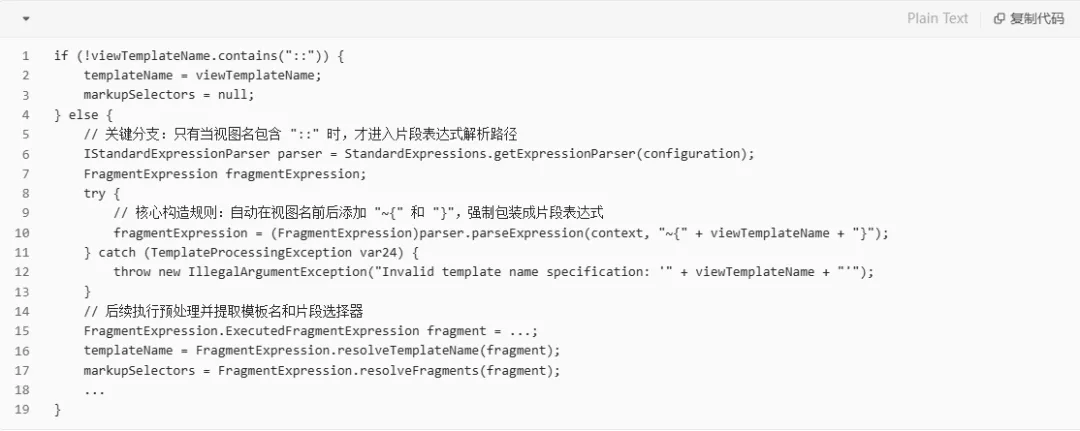 核心在于片段表达式(Fragment Expression)的构造规则,即视图名(view name)中包含 :: 时,会被解析为 ~{templateName :: fragmentSelector} 形式,并在 fragment selector(:: 后的部分)上触发表达式预处理(preprocessing),从而执行恶意 SpEL。
