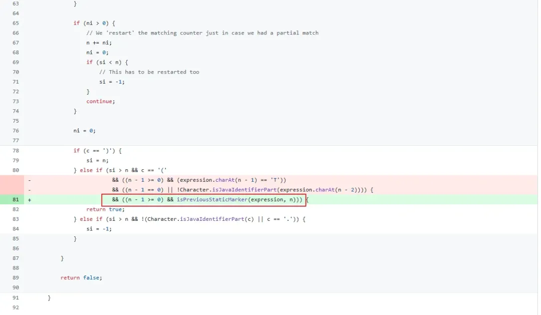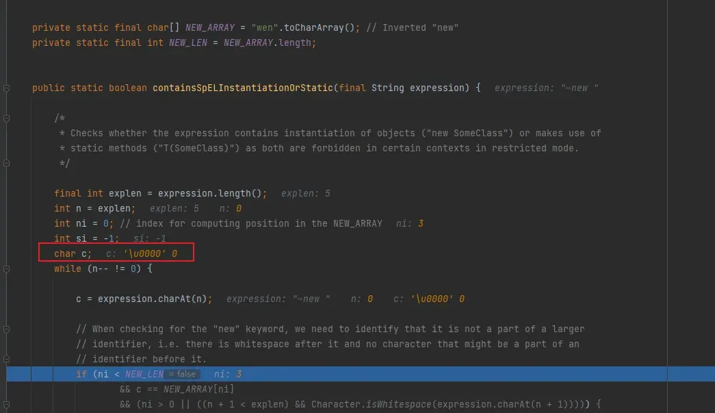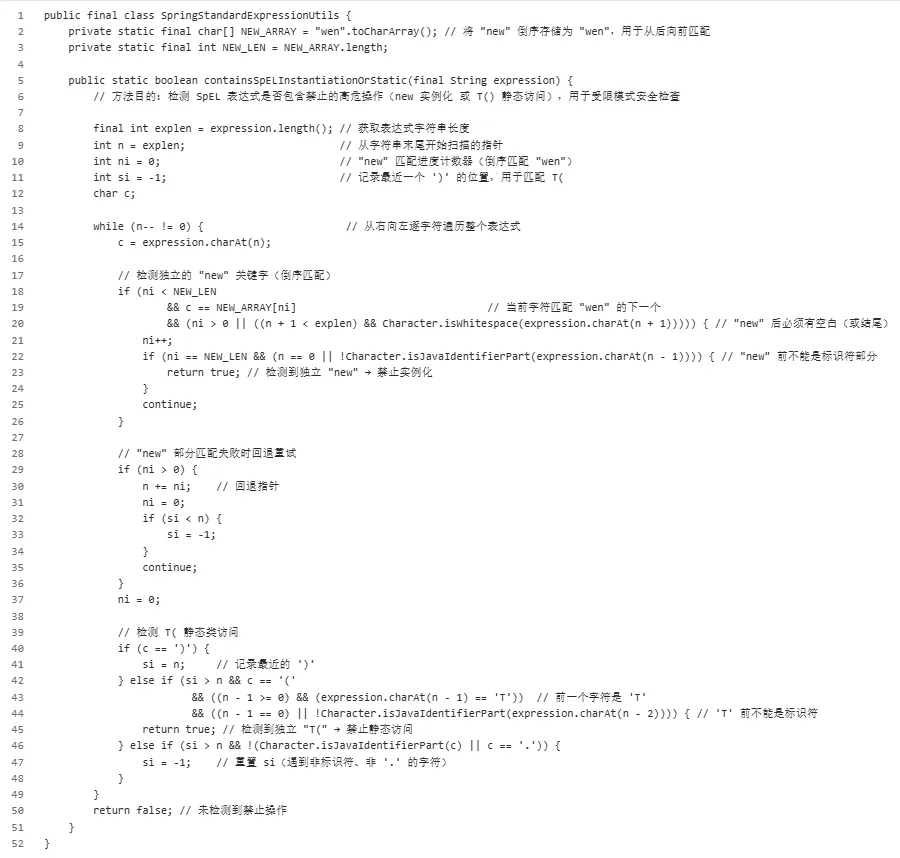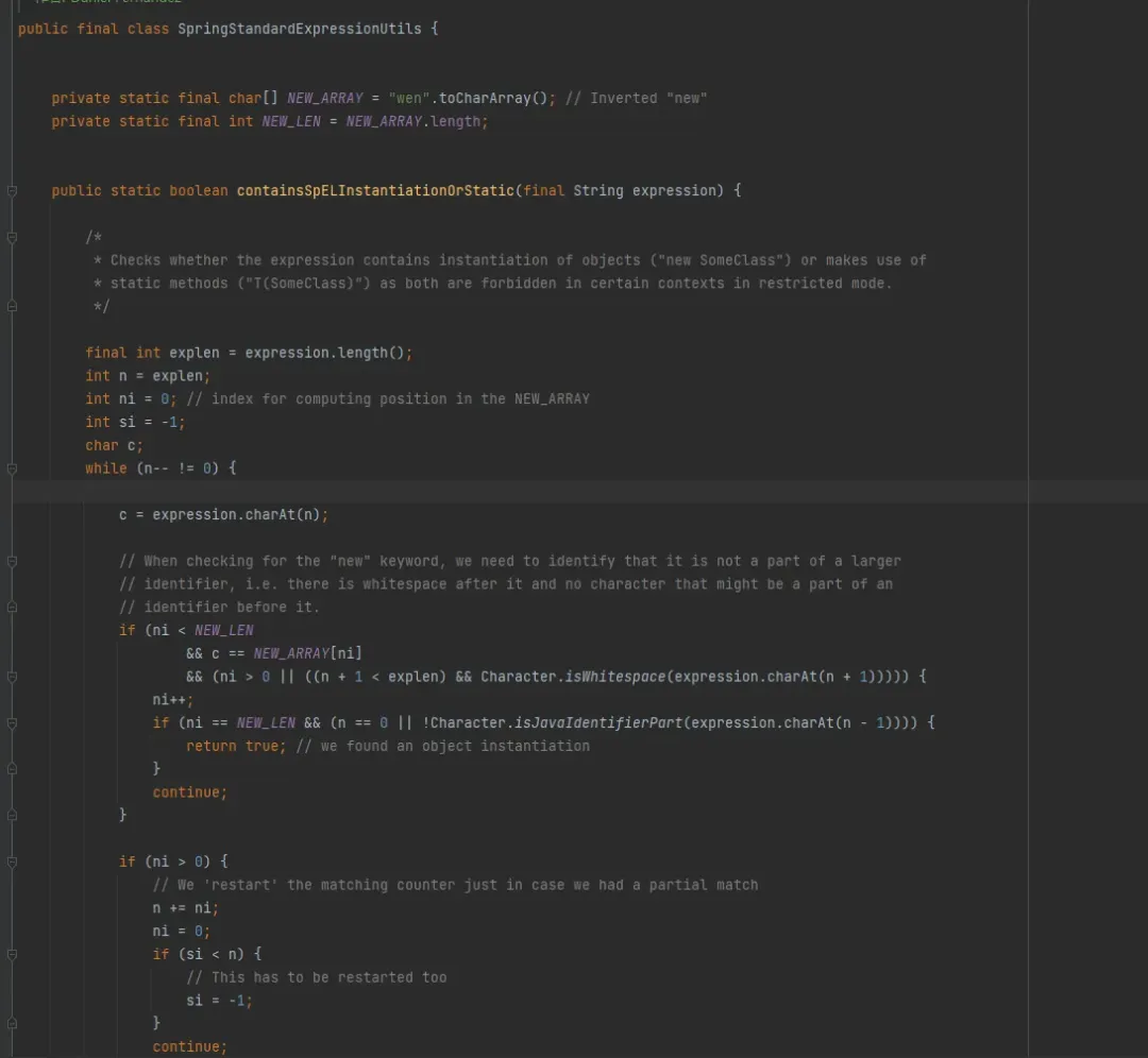这个方法通过从右向左倒序扫描 SpEL 表达式字符串,严格检测独立的“new”(对象实例化)和 “T(”(“T”不能和“(”在一起)关键字,若存在则返回 true 以在受限模式下禁止执行,防止 SSTI 导致的任意代码执行。这里没有进行严格的大小写限制,且SPEL不区分大小写,我们可以用“New”进行绕过。
