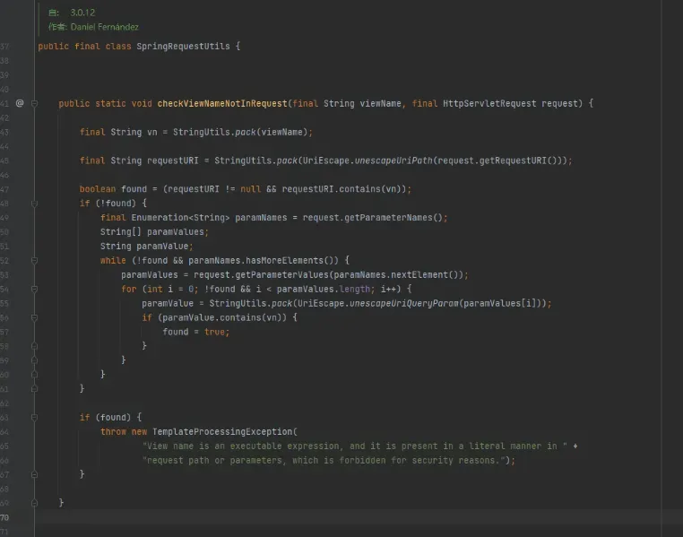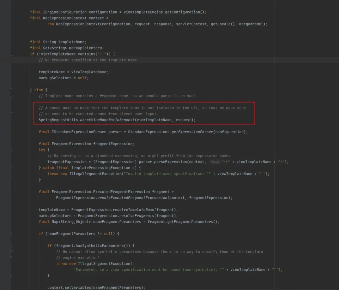除此之外,3.0.12版本在org.thymeleaf.spring5.view.ThymeleafView.java中引入了新的一行检测代码 ,此方法检查视图名中是否包含了直接来自用户 HTTP 请求输入的内容,如果包含则抛出异常,阻止渲染(值得一提的是这个方法只对传入参数为路径时生效)。