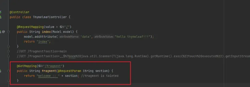 可以看到这就是一个典型的Thymeleaf漏洞案例,直接渲染我们输入的Fragment参数: