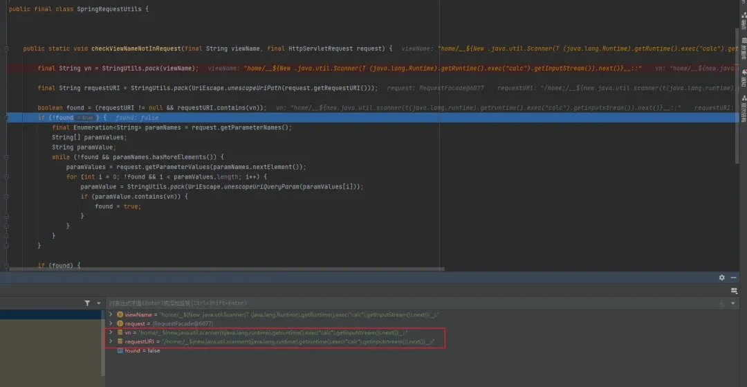 进入看看如何进行校验的,vn值是对我们输入的PoC进行规范化(去除多余空白、统一格式)后赋值的。requestURI值是解码后的url请求路径。如果请求路径包括我们输入的PoC→ 抛出异常,中止渲染。