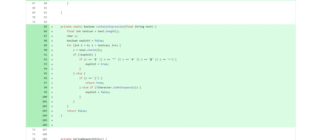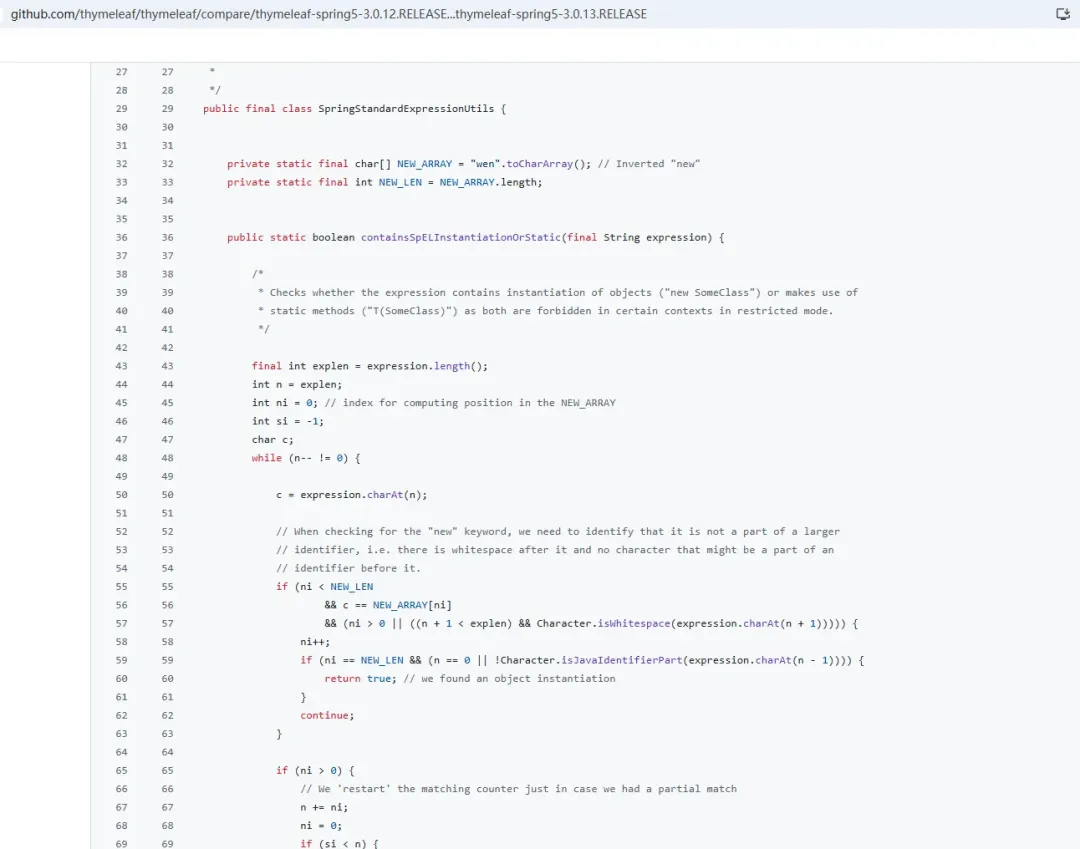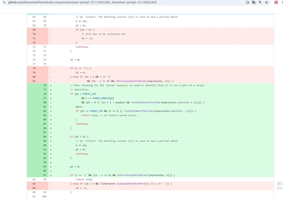 对比3.0.13版本,我们可以看到:https://github.com/thymeleaf/thymeleaf/compare/thymeleaf-spring5-3.0.13.RELEASE…thymeleaf-spring5-3.0.14.RELEASEorg.thymeleaf.spring5.util.SpringStandardExpressionUtils#isPreviousStaticMarker新增了以下方法:此方法是检测是否出现了“param”关键字。禁止模板中使用 ${#param.xxx} 或 ${param.xxx} 来直接访问 HTTP 请求参数。当然了,此检测还是可以通过大小写进行绕过,且对new的检测逻辑不变,也可以用此方法绕过。