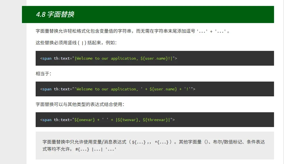 查看官方文档获取详情:https://www.thymeleaf.org/doc/tutorials/3.0/usingthymeleaf.html?referrer=baidu.com#literal-substitutions