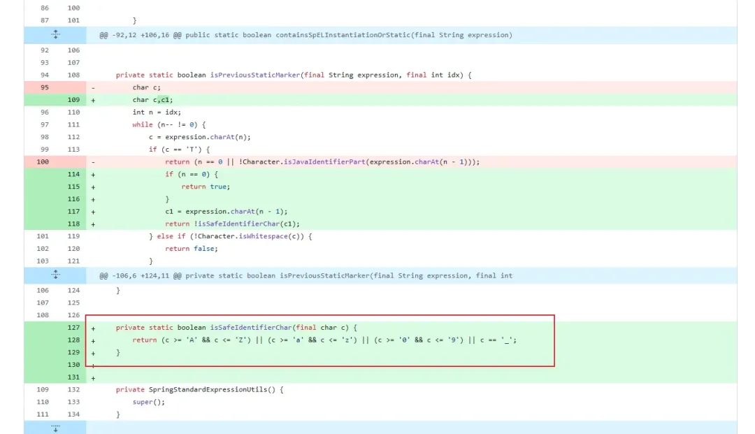 那么就可以执行后面的SPEL表达式了,我们再看看org.thymeleaf.spring5.util.SpringStandardExpressionUtils#isPreviousStaticMarker,是否对T关键字有了新的变化,发现了一个“isSafeIdentifierChar”检测,“isSafeIdentifierChar”方法要求我们输入的内容为可见字符串,因而原先的制表符以及%00绕过方法已经无法使用了。
