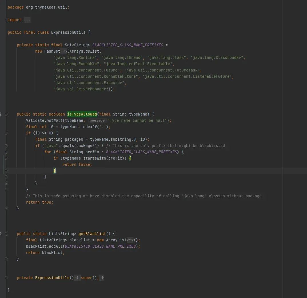 这个版本thymeleaf-spring5的检测逻辑无较多变化,但是在thymeleaf本体中增加了一些检测以及黑名单。org.thymeleaf.util.ExpressionUtils#isTypeAllowed
