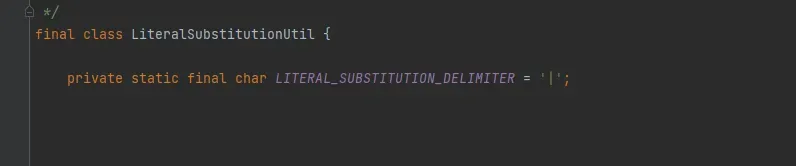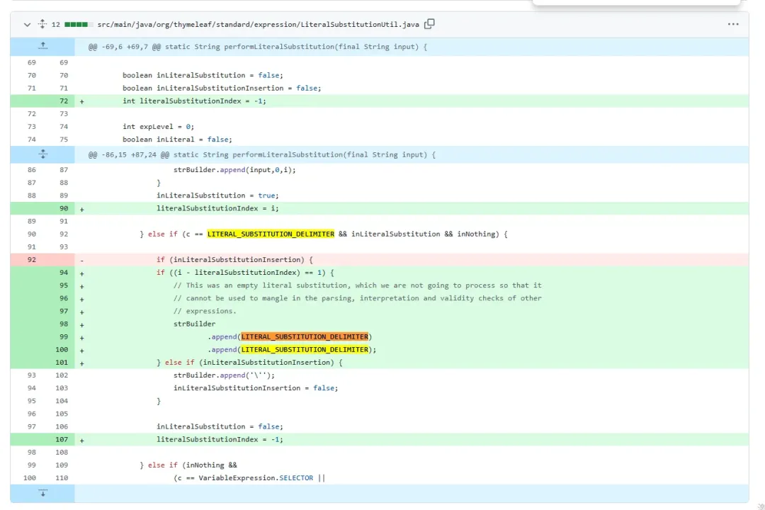 此外,在org.thymeleaf.standard.expression.LiteralSubstitutionUtil#performLiteralSubstitution中对3.0.14的“$||{…}”方式进行了修复,这里的LITERAL_SUBSTITUTION_DELIMITER定义的值为“|”,但是“|$${…}|::.”格式的PoC还是可以继续使用。